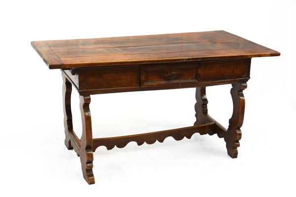 Tavolo scrittoio di forma rettangolare ad un cassetto nella fascia, gambe e traverse sagomate (cm 150x80x80) (difetti)