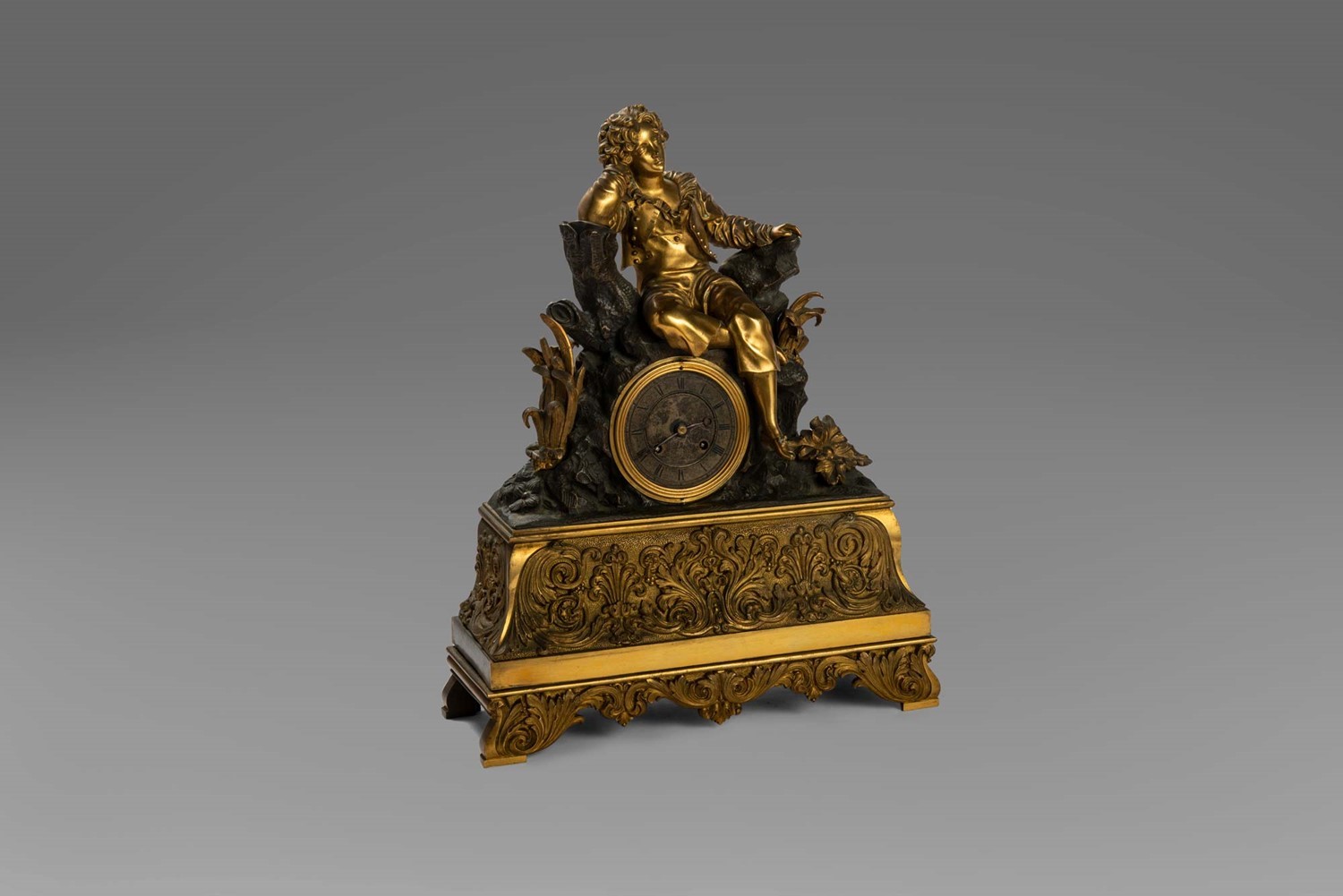 Lotto 56 | Pendola in bronzo dorato e a patina scura, con giovinetto seduto, secolo XIX