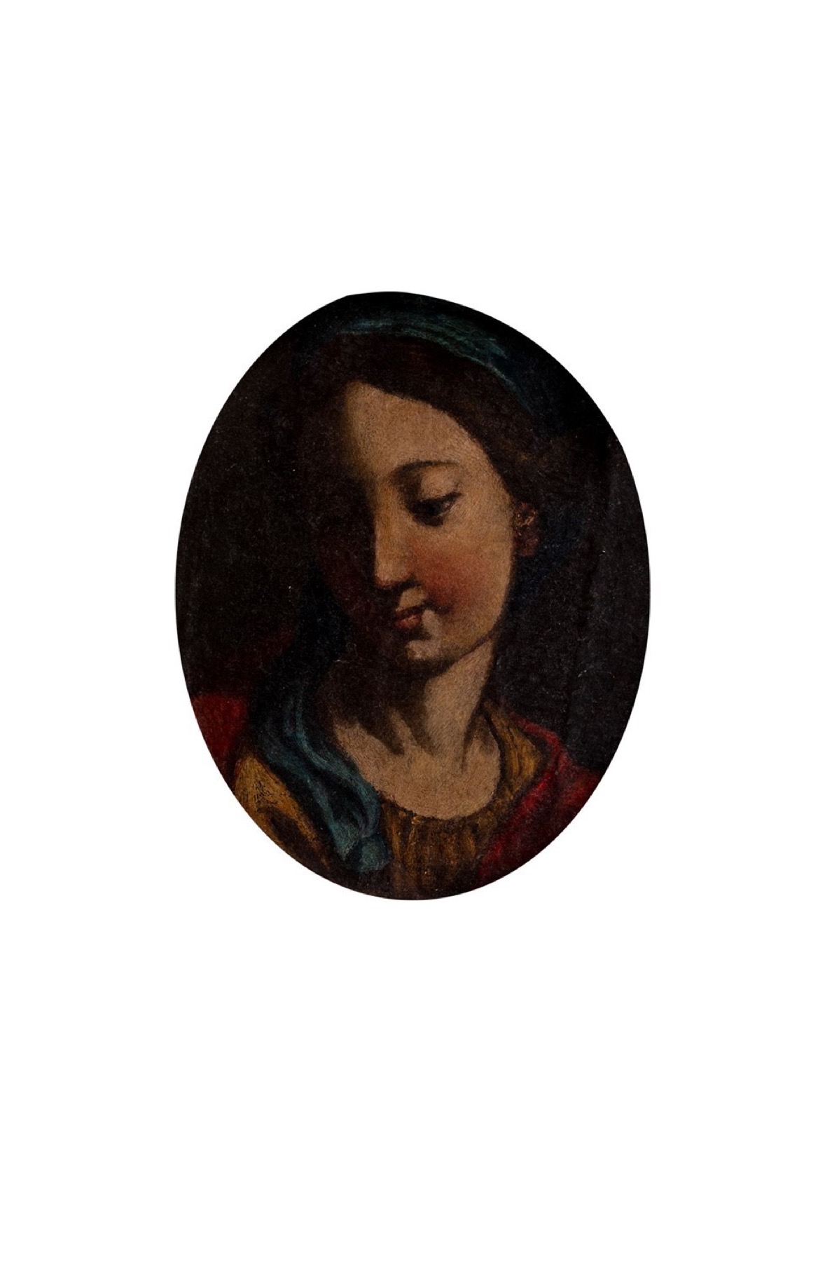 olio su carta, applicata su tavola, in ovale, entro cornice coeva