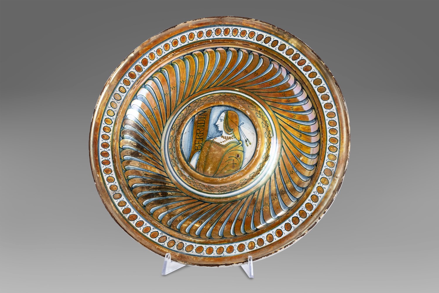 in maiolica decorata in blu di cobalto con lumeggiature a lustro dorato
