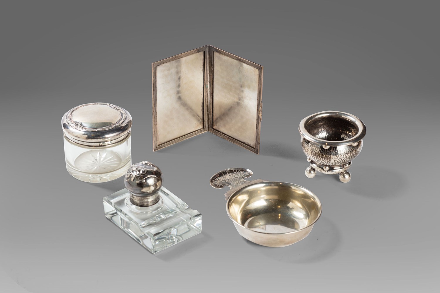 Lotto composto da 5 oggetti : un calamaio in cristallo e argento, un vasetto in cristallo con coperchio in argento, un portafoto in argento, un taste vin in argento e un piccolo vaso in argento