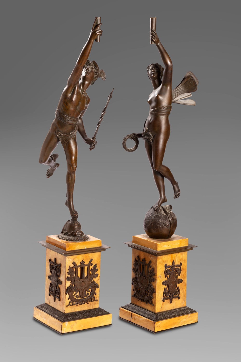 Due sculture in bronzo raffiguranti Vittoria e Hermes, base in marmo giallo di Siena, Francia, metà secolo XIX