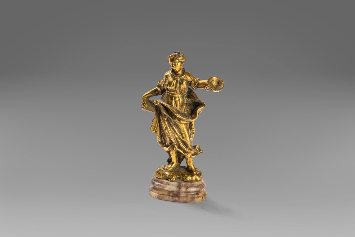 Piccola scultura in bronzo dorato, con base in marmo, raffigurante figura femminile allegorica, Firenze secolo XVII