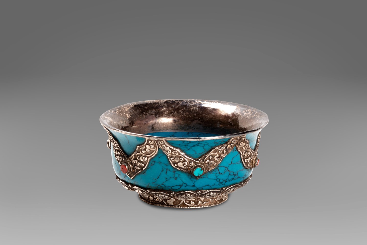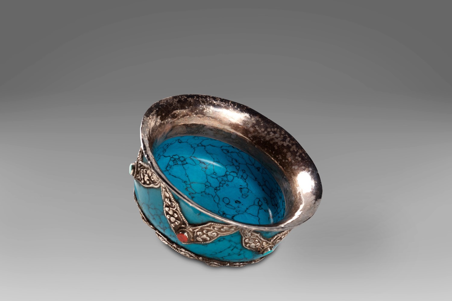 Coppa tibetana in pietra saponaria, decorazioni in argento con pietre turchesi e coralli, inizi secolo XX
