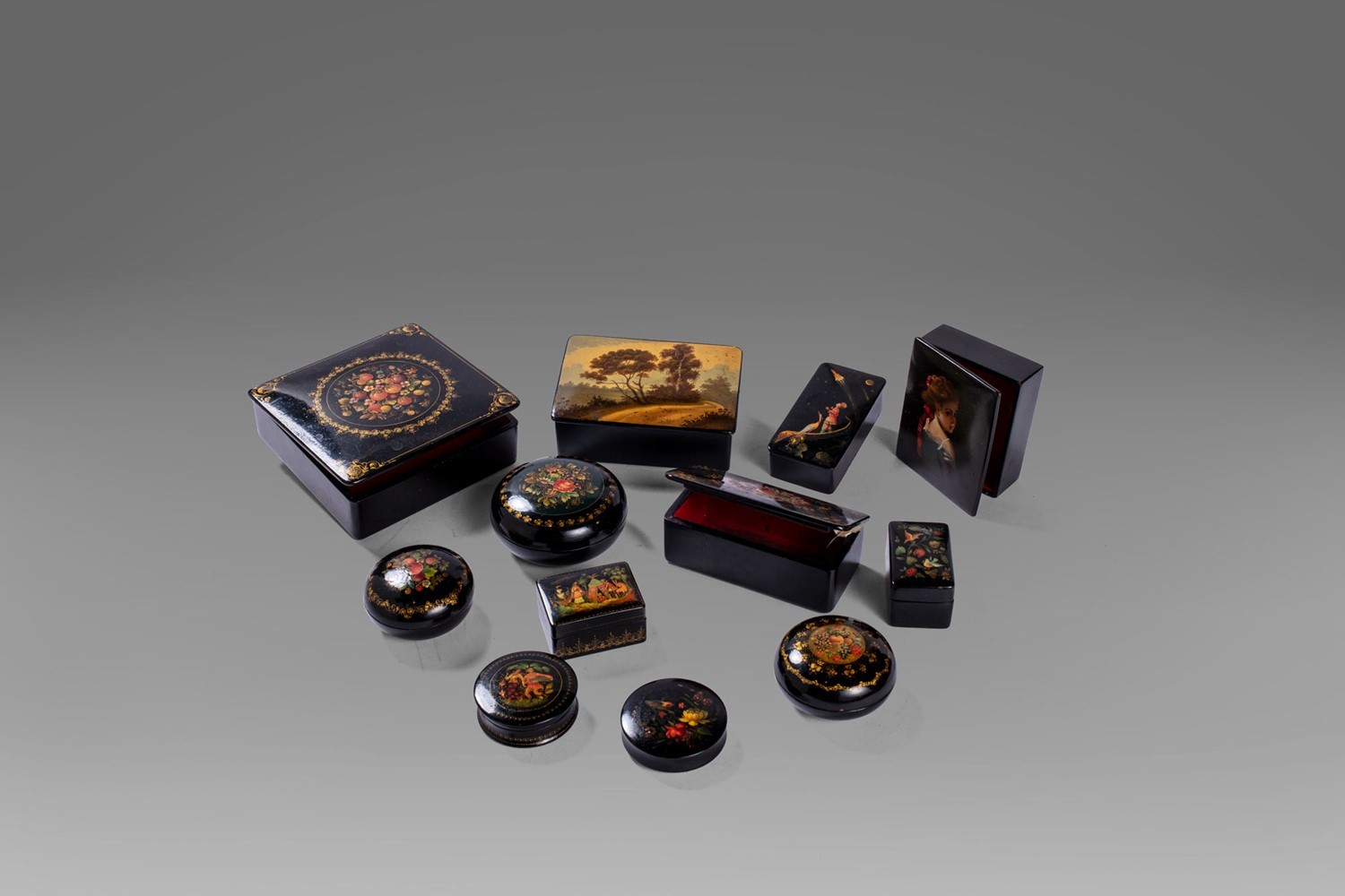 Lotto di 12 scatole in papier-maché, di misure e forme diverse