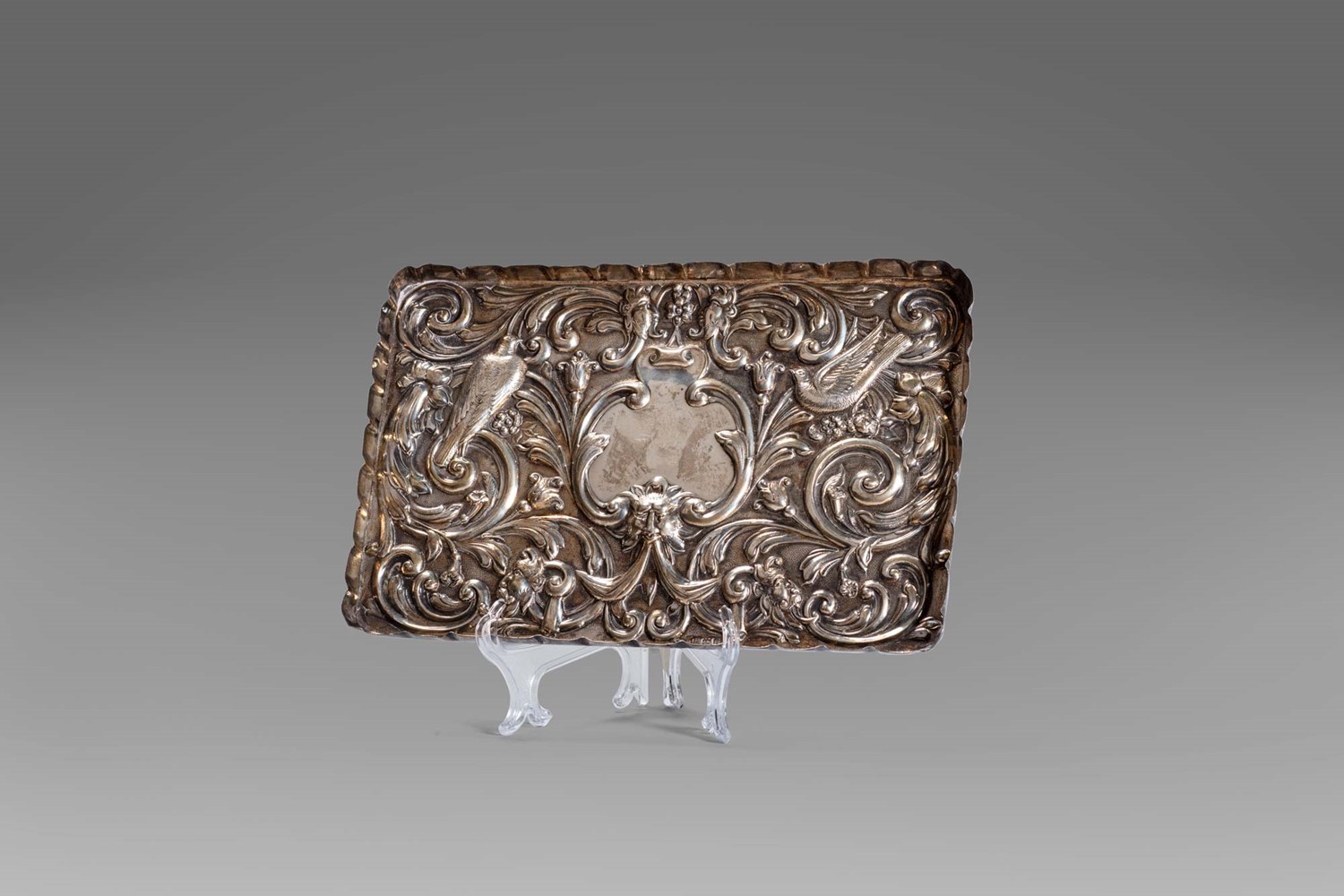 Vassoio in argento sbalzato con motivi floreali, mascherone centrale e uccellini