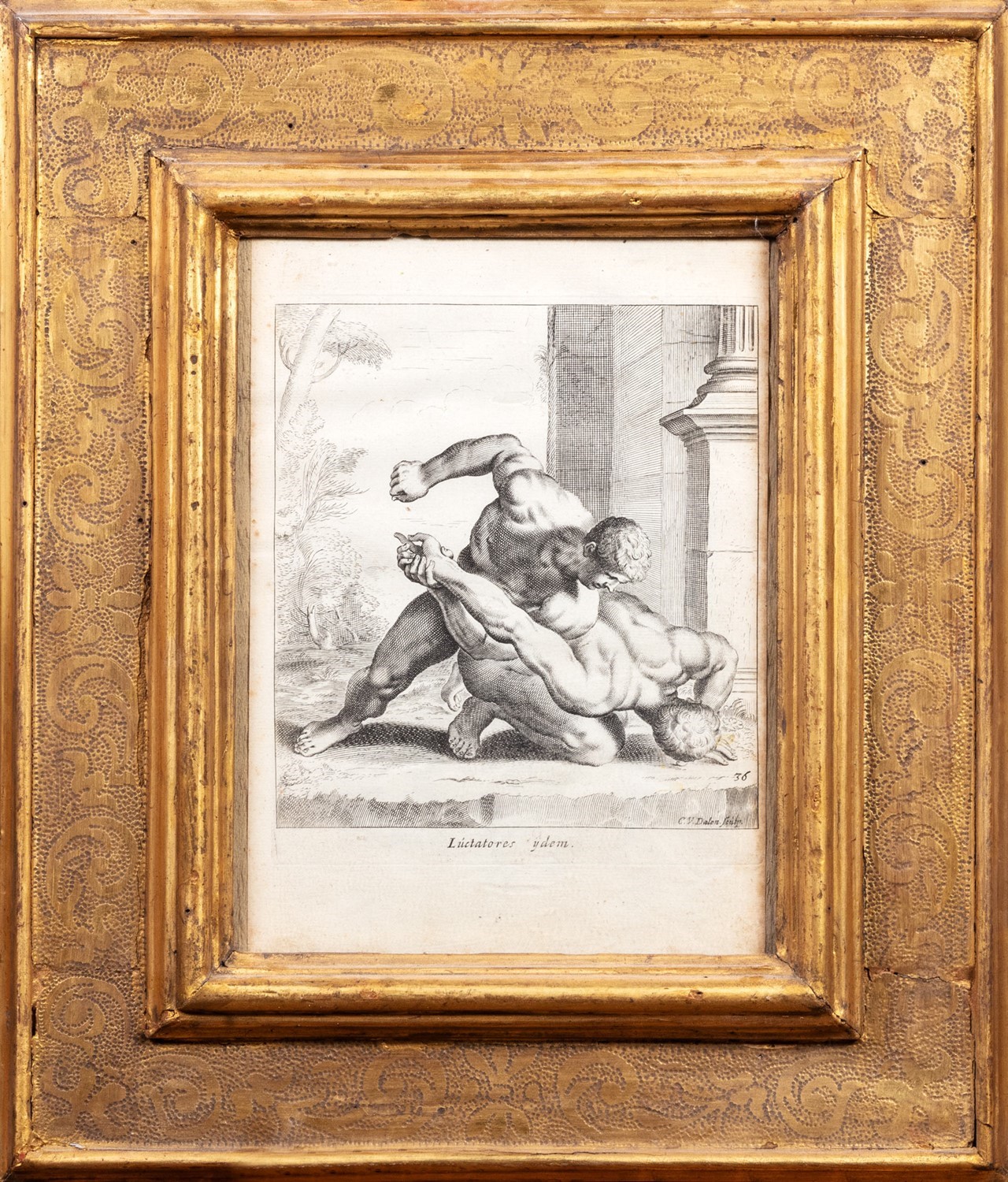 Coppia di cornici emiliane, secolo XVIII, con due stampe dei Lottatori di Villa Medici
