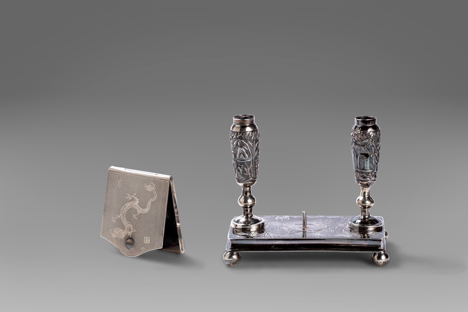 Lotto composto da portapenne in argento firmato Wang Hing e portafiammiferi in argento, Cina secolo XX