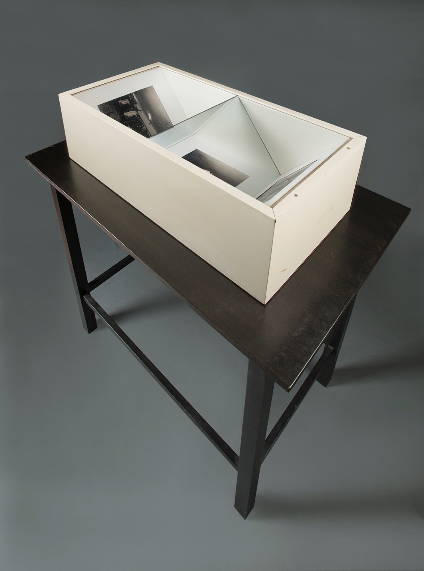 Due stampe vintage alla gelatina ai sali d'argento, due specchi, box in legno e vetro, sgabello