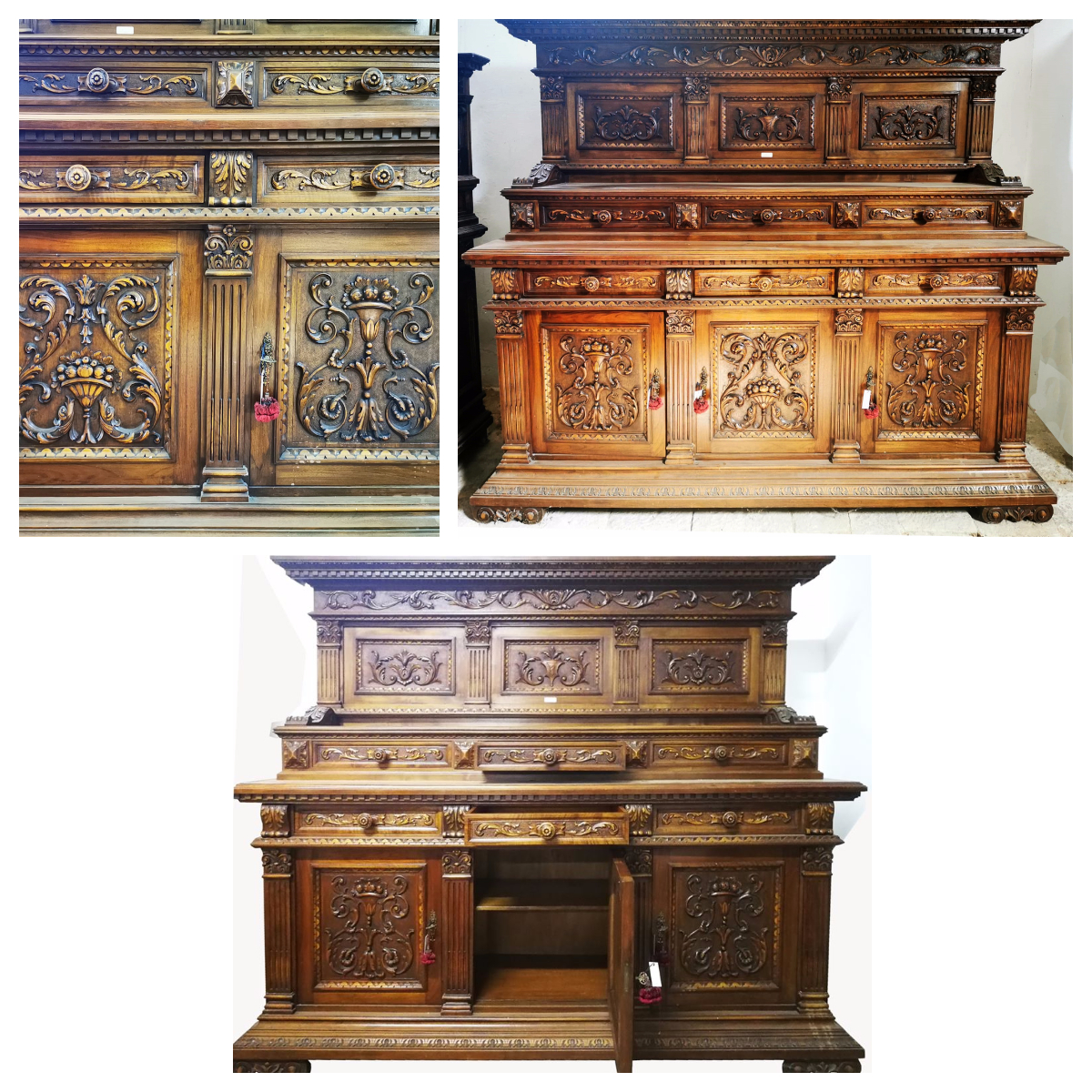 CREDENZA IN STILE NEORINASCIMENTALE. Credenza con tre ante alla base impreziosite da pannelli intagliati a volute e fiori, doppia fascia da tre cassetti ed alzata con piano rettangolare. Mobile molto particolare, capiente ed in buono stato conservativo. Dimensioni: H 193 cm, L 224 cm, P 62 cm.