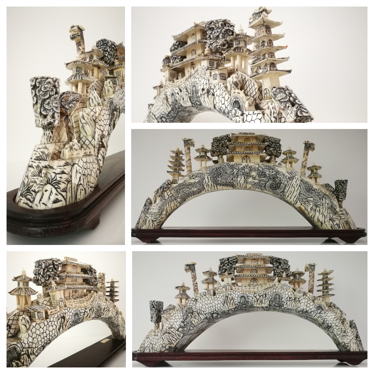 CACHEPOT. Zanna, riproduzione in osso periodo Meiji interamente scolpita, con base in legno. Dimensioni: H 37,5 cm, L 72 cm.