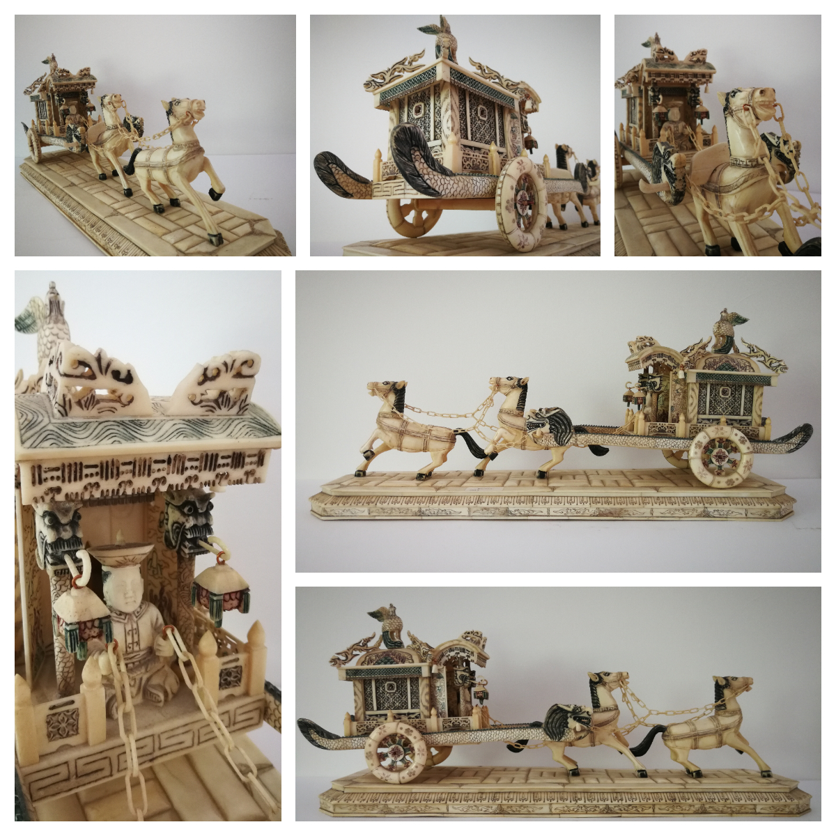 SCULTURA. Carrozza con cavalli, riproduzione in osso periodo Meiji. Dimensioni: H 29 cm, L 67 cm, P 22 cm.