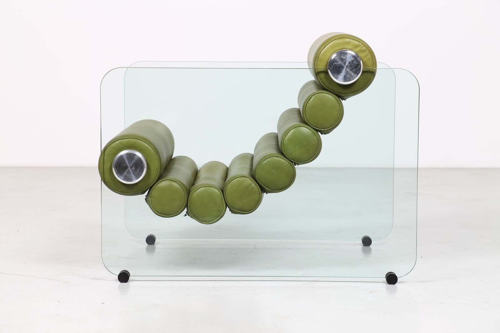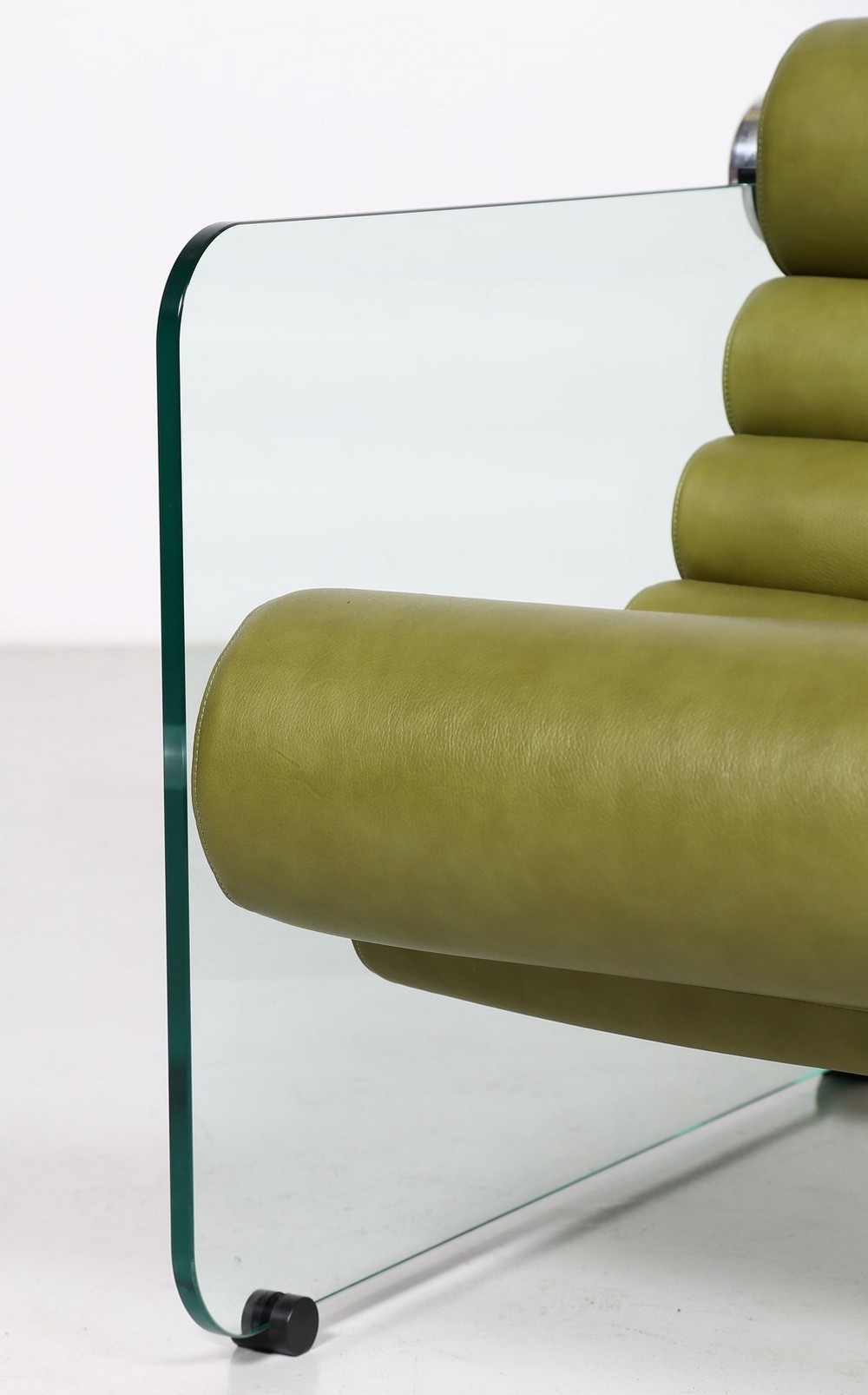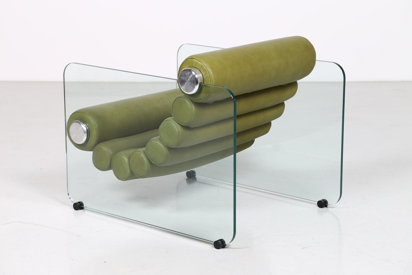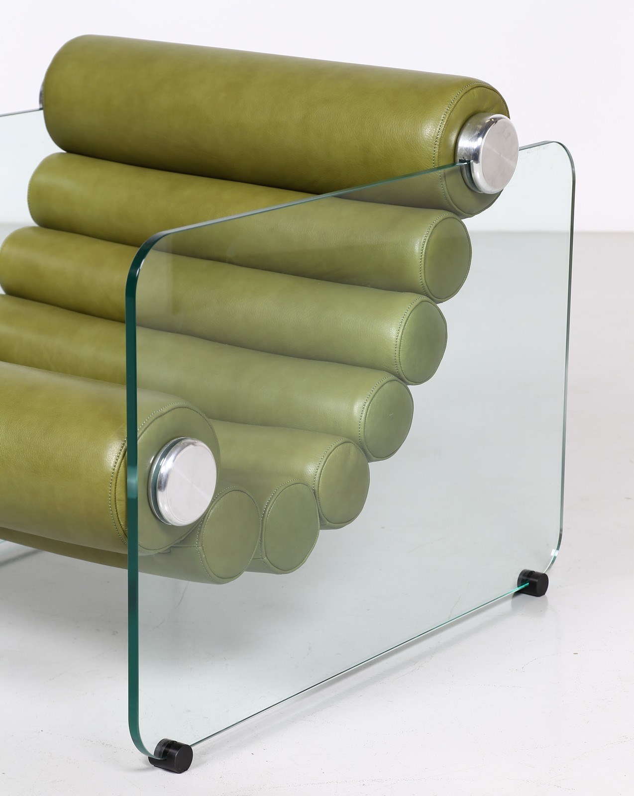 LENCI FABIO (n. 1935) Poltrona modello Hyaline, produzione Comfort Line, anni '70. Cristallo molato e pelle imbottita. Cm 70,00 x 73,00 x 90,00.