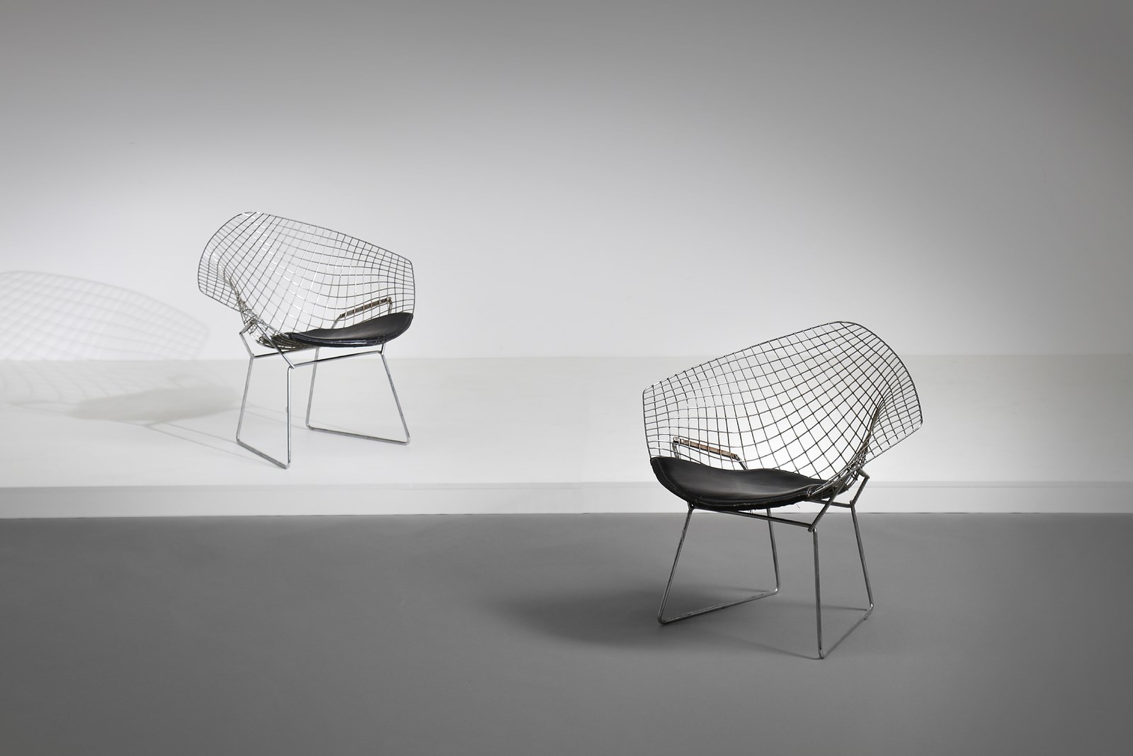 HARRY BERTOIA (1915 - 1978) Coppia poltrone modello Diamond produzione Knoll, 1952. Acciaio cromato e pelle. Cm 84,00 x 76,00 x 48,00. Bibliografia: Charlotte&Peter Fiell, 1000 chairs, Taschen, 2017, p. 253