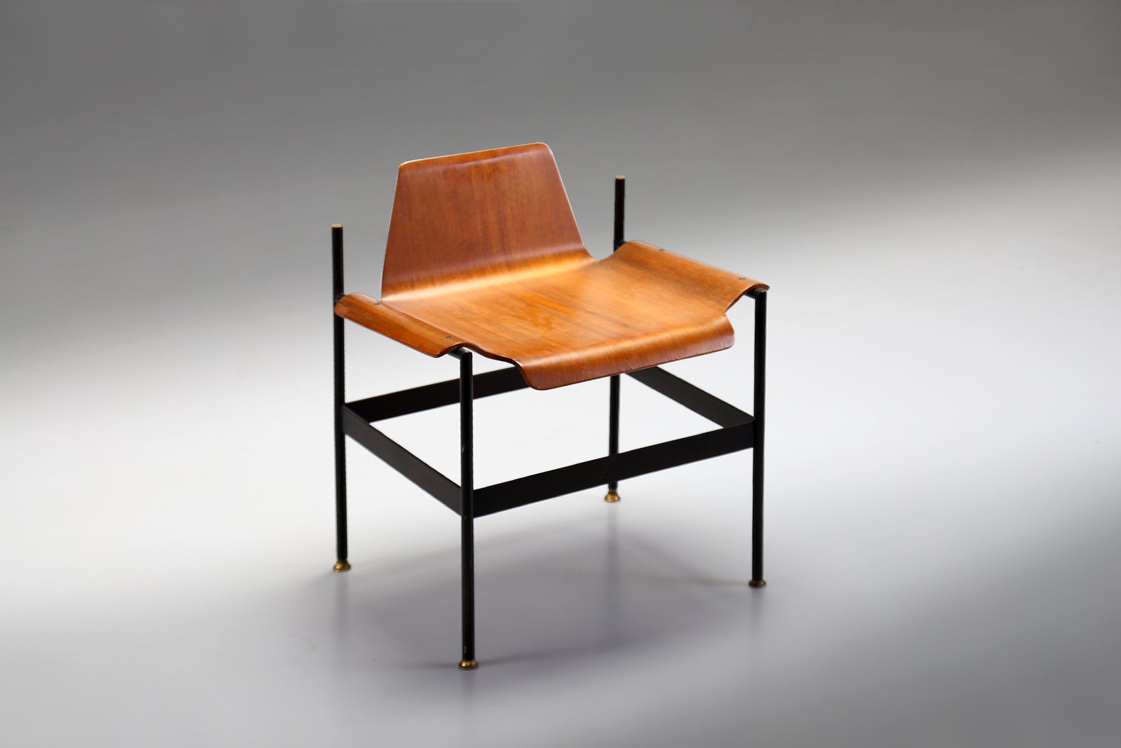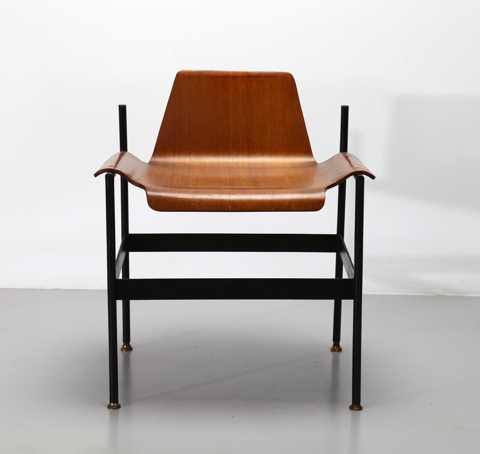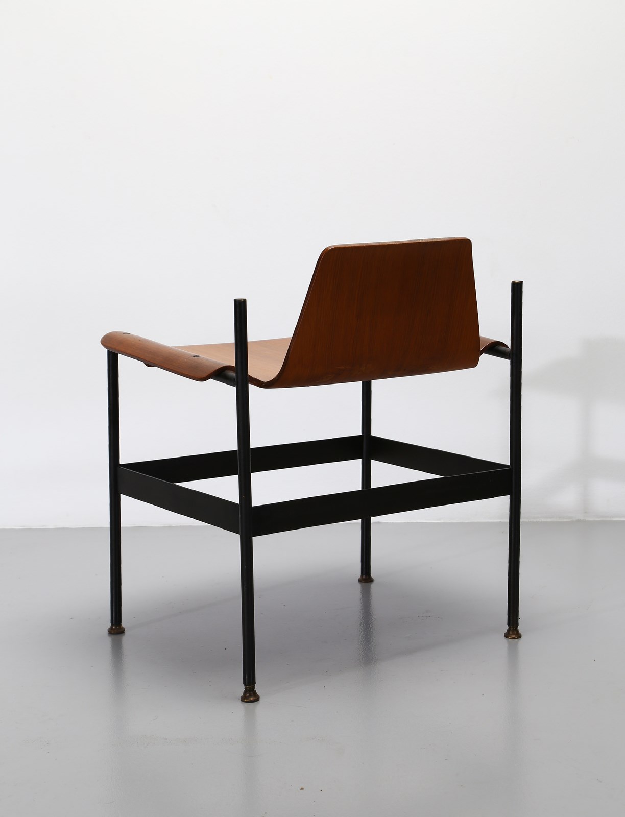 RINALDO SCAIOLI - EUGENIA ALBERTI REGGIO Sedia, produzione La Permanente mobili Cantù, 1959. Legno di teak, metallo verniciato e ottone.. Cm 53,00 x 59,00 x 42,00.