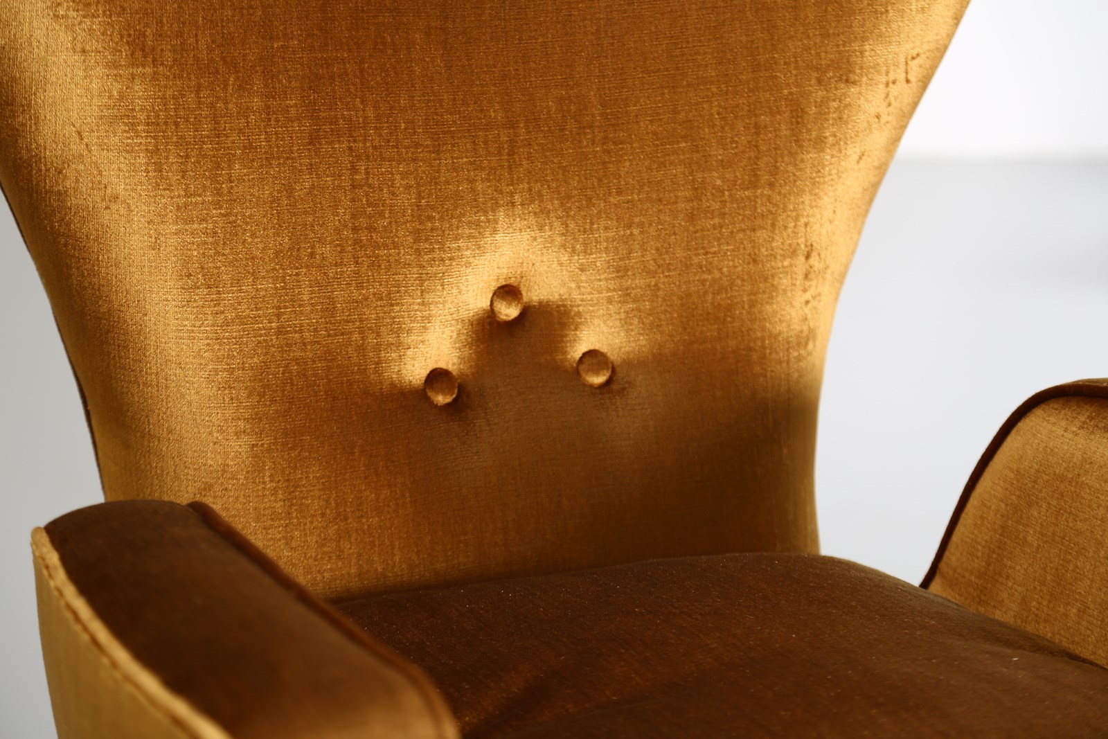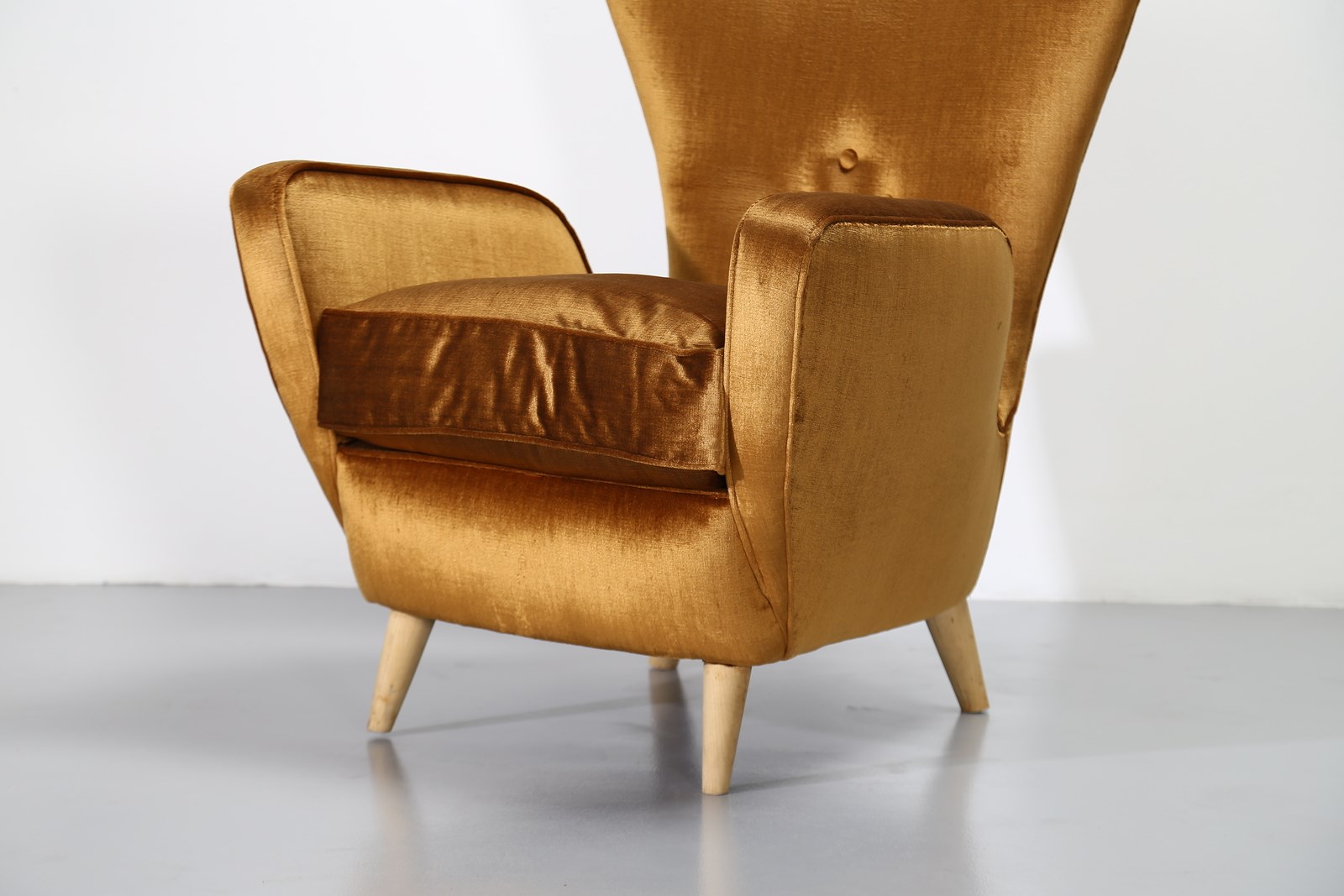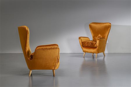 EMILIO SALA Coppia di poltrone anni '60. Legno di acero e tessuto. Cm 70,00 x 94,00 x 70,00. Bibliografia: Rivista dell'Arredamento n. 90, 1963, p. 20