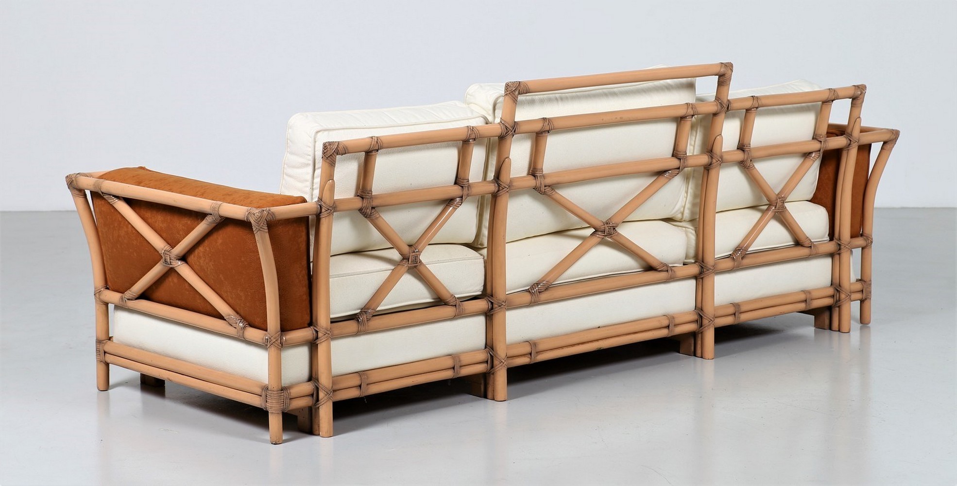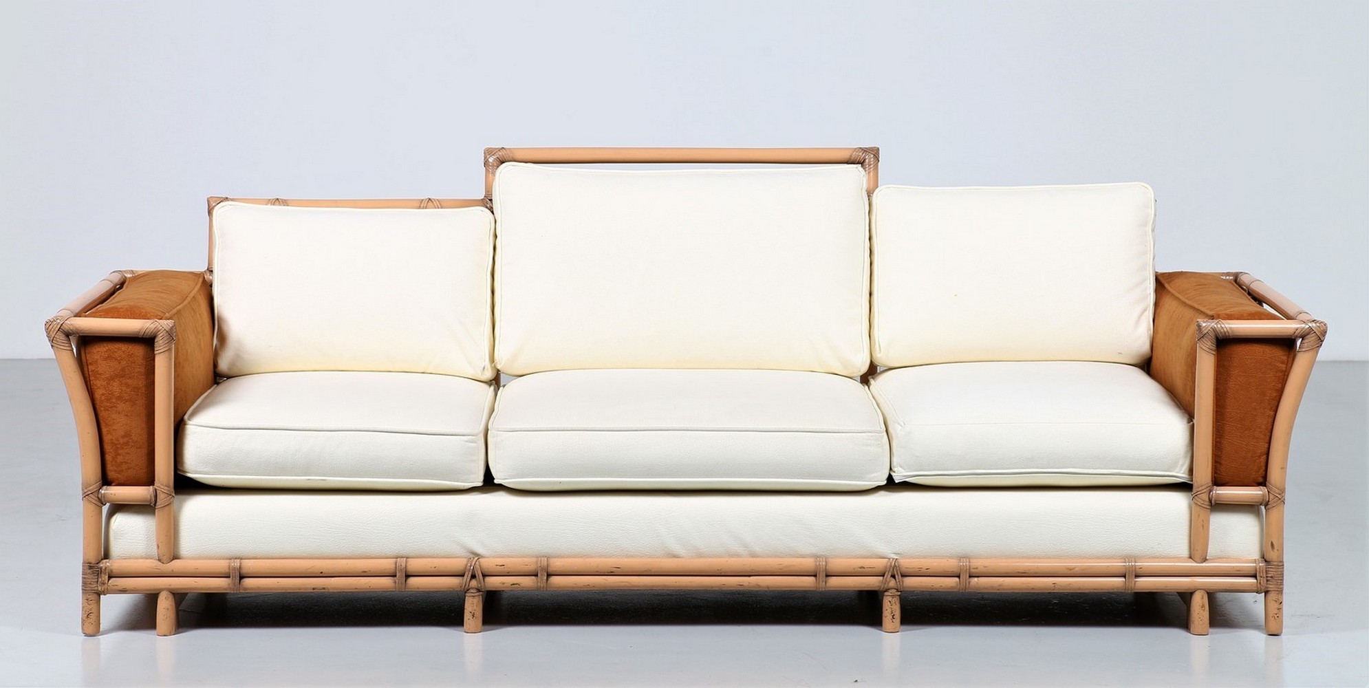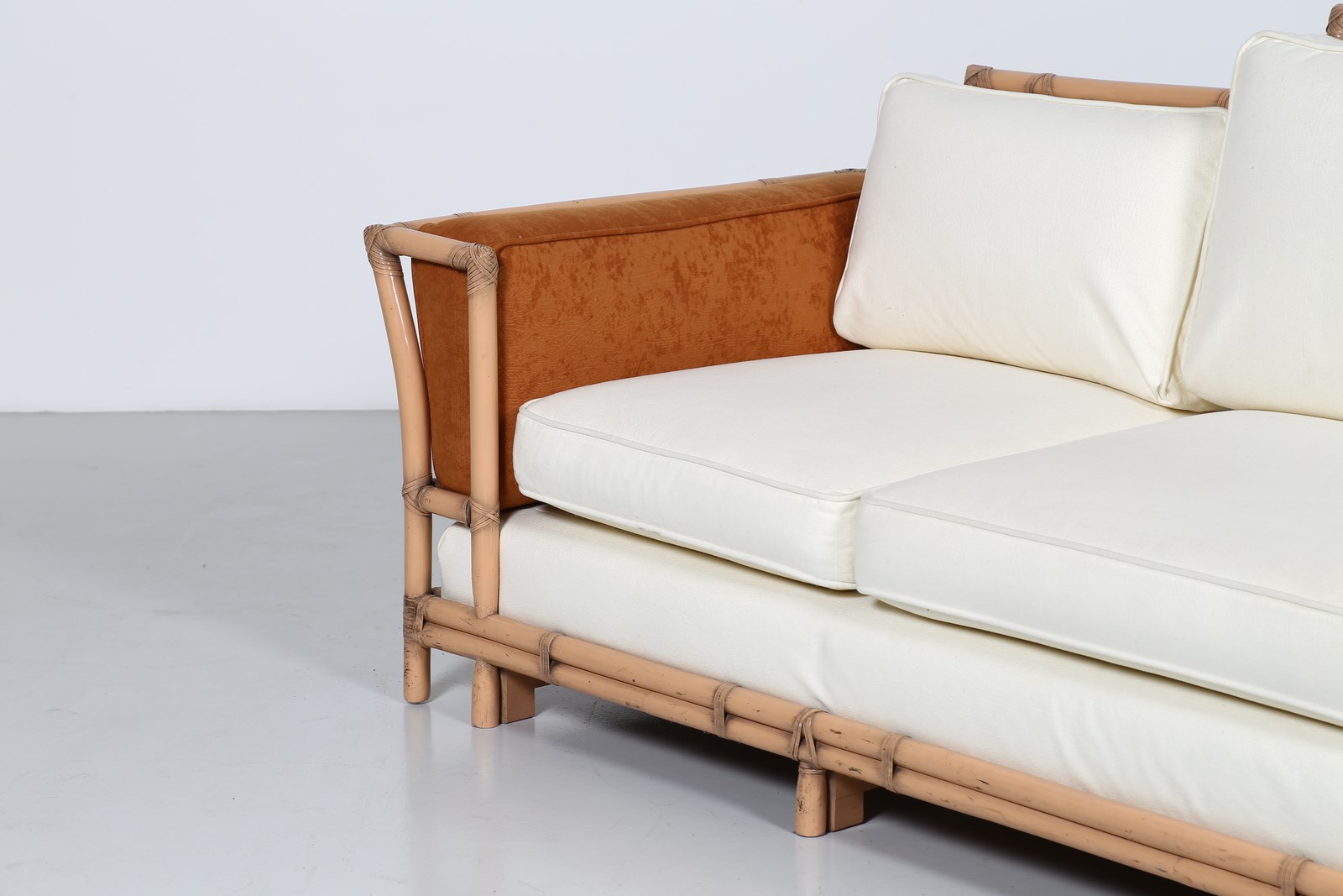 GASPARUCCI ITALO Divano anni '60. Bambù e tessuto. Cm 240,00 x 87,00 x 86,00. Etichetta della manifattura.