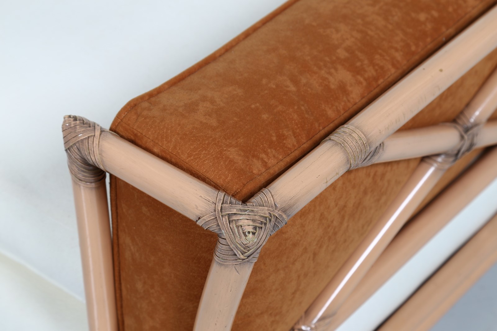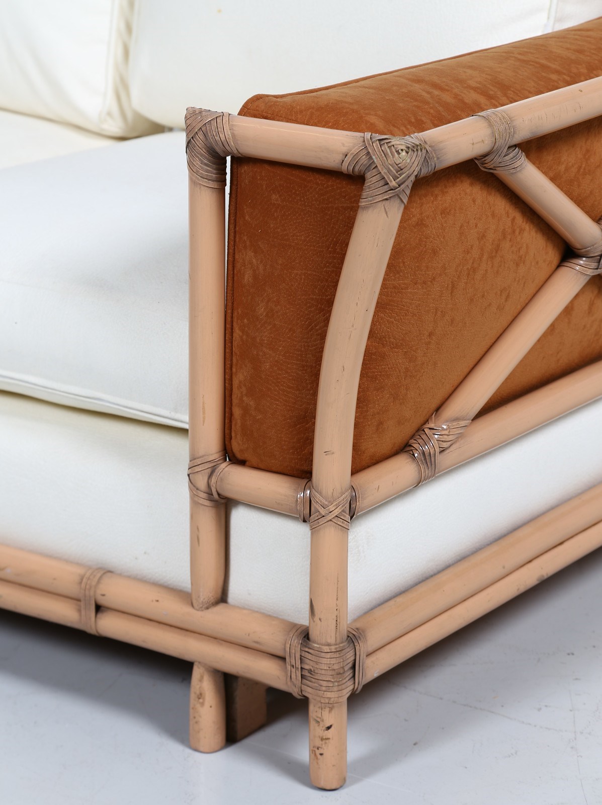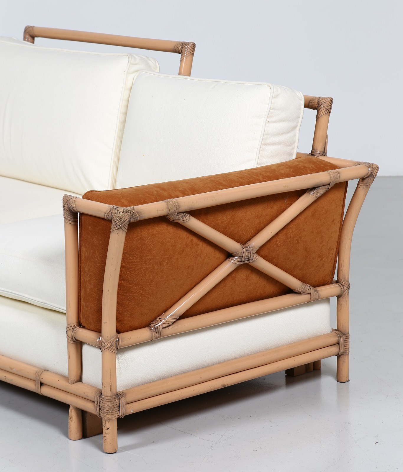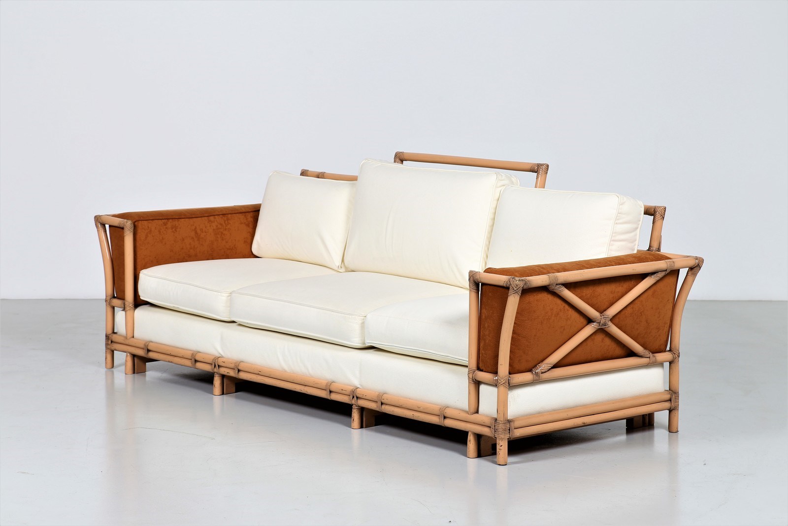 GASPARUCCI ITALO Divano anni '60. Bambù e tessuto. Cm 240,00 x 87,00 x 86,00. Etichetta della manifattura.