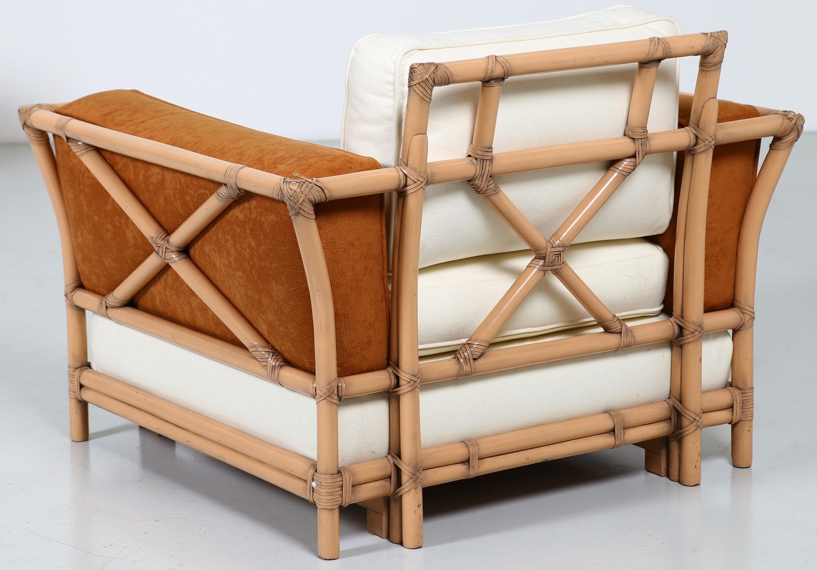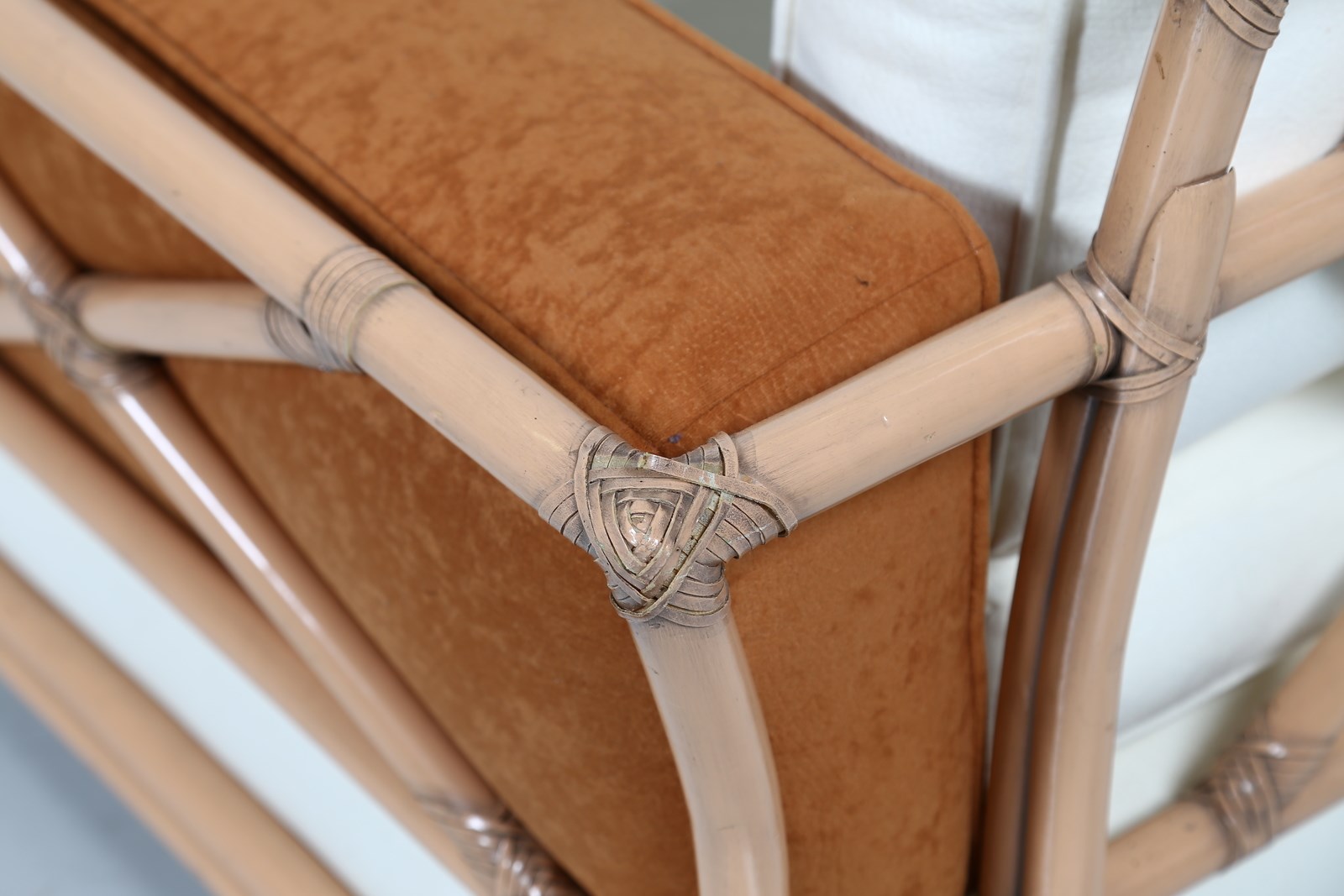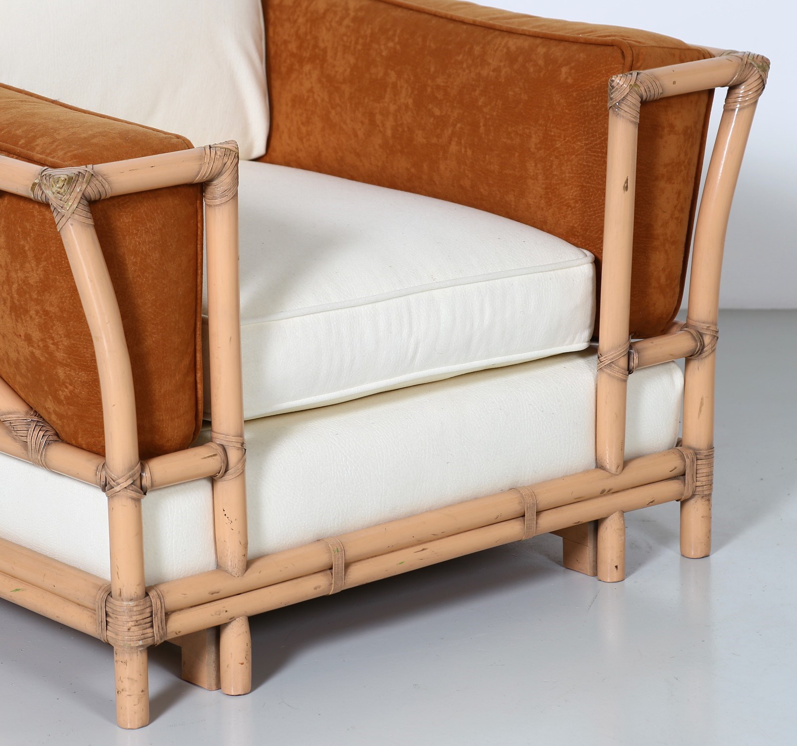 GASPARUCCI ITALO Coppia di poltrone anni '60. Bambù e tessuto. Cm 86,00 x 77,00 x 100,00. Etichetta della manifattura.