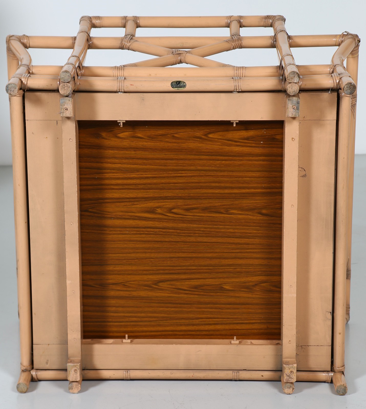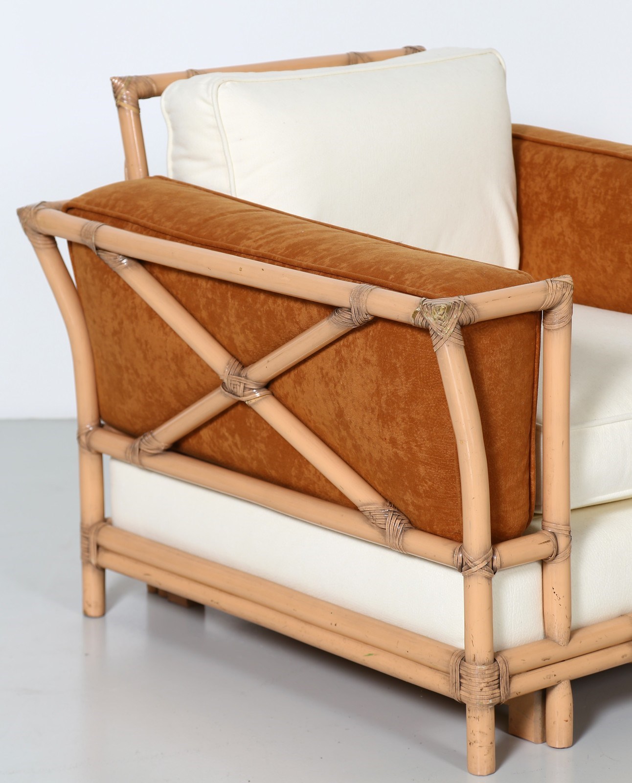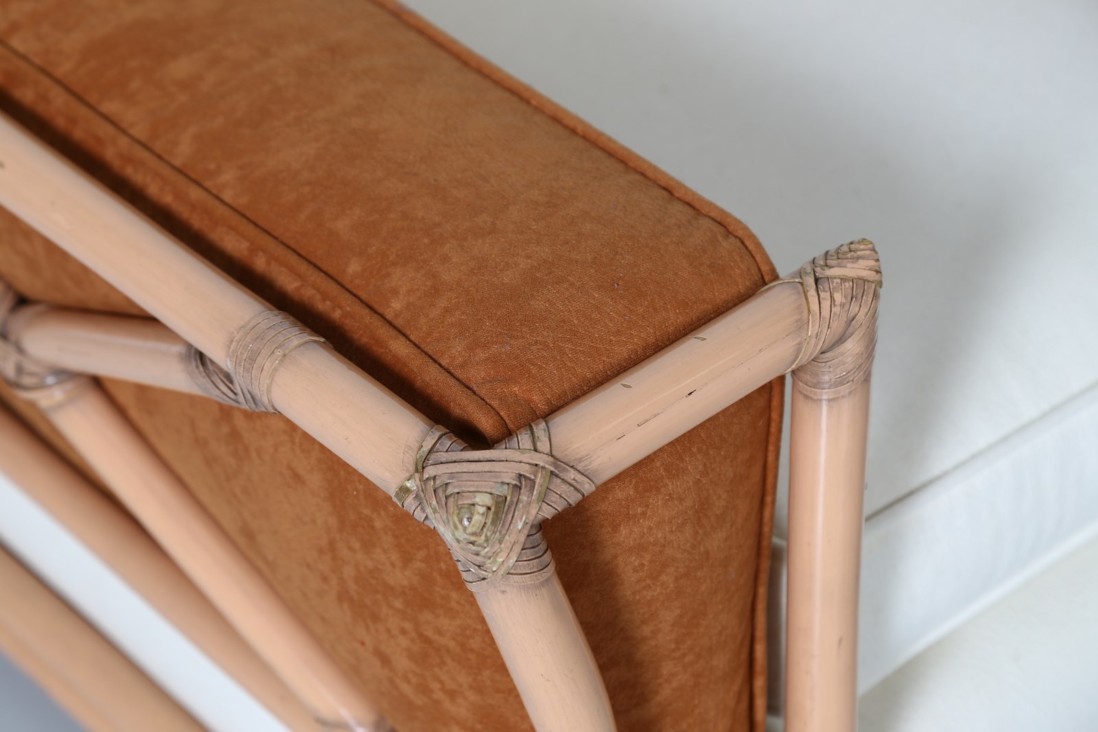 GASPARUCCI ITALO Coppia di poltrone anni '60. Bambù e tessuto. Cm 86,00 x 77,00 x 100,00. Etichetta della manifattura.
