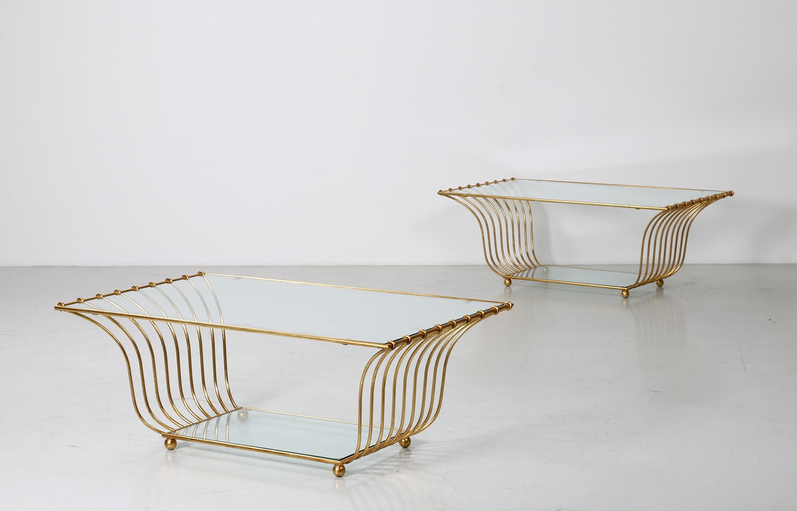 BANCI FIRENZE Coppia di tavolini, anni '70. . Metallo dorato e cristallo molato.. Cm 120,00 x 48,00 x 72,00.