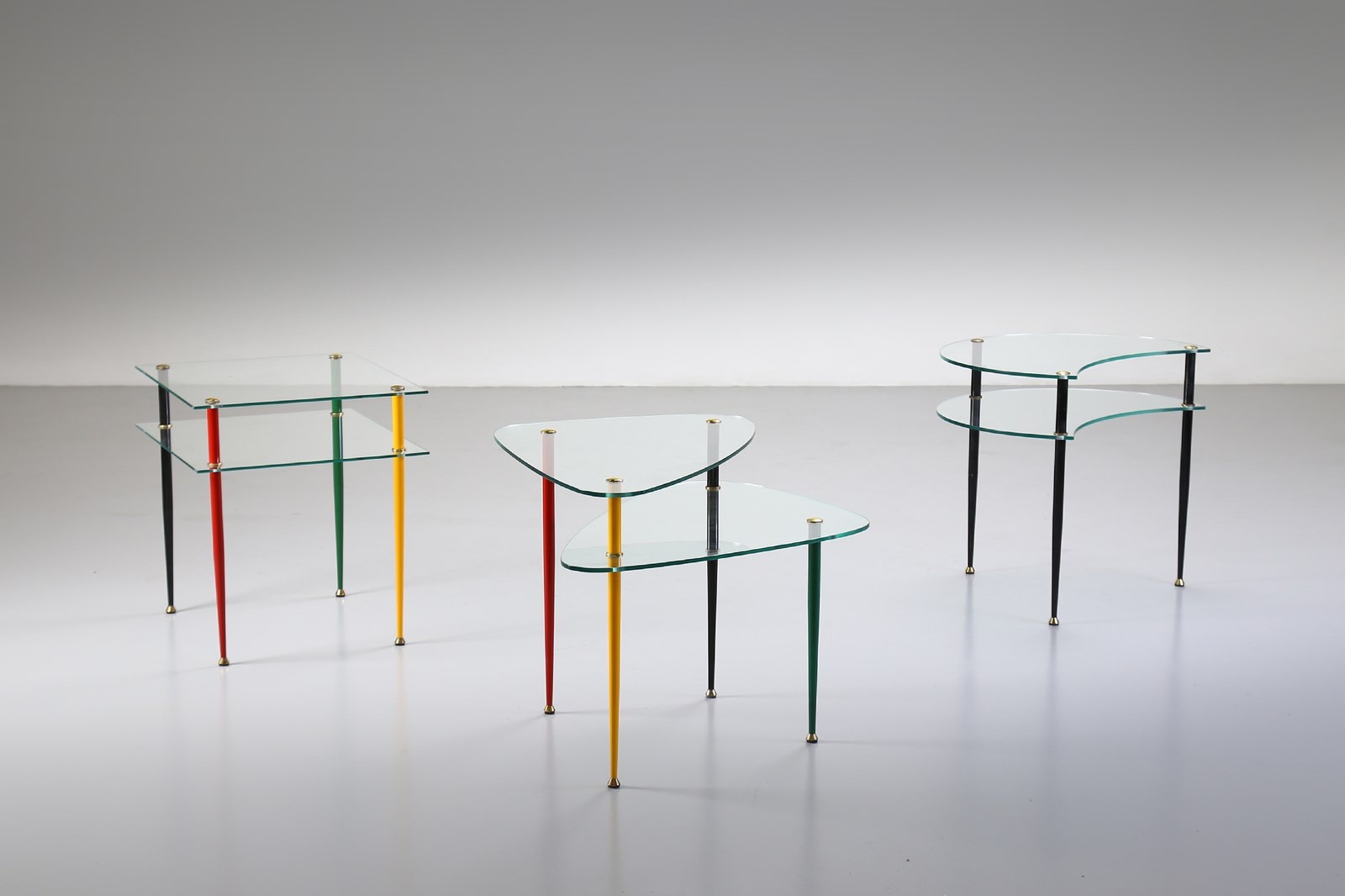 PAOLI EDOARDO Tre tavolini da salotto, produzione Vitrex anni '50. (3). Ottone, metallo verniciato e cristallo molato.. Cm 75,00 x 54,50 x 70,00. Marchio della manifattura. Tavolino mezzaluna: 54,5 x 59 x 50 cm / Tavolino quadrato: 54,5 x 54 x 48 cm