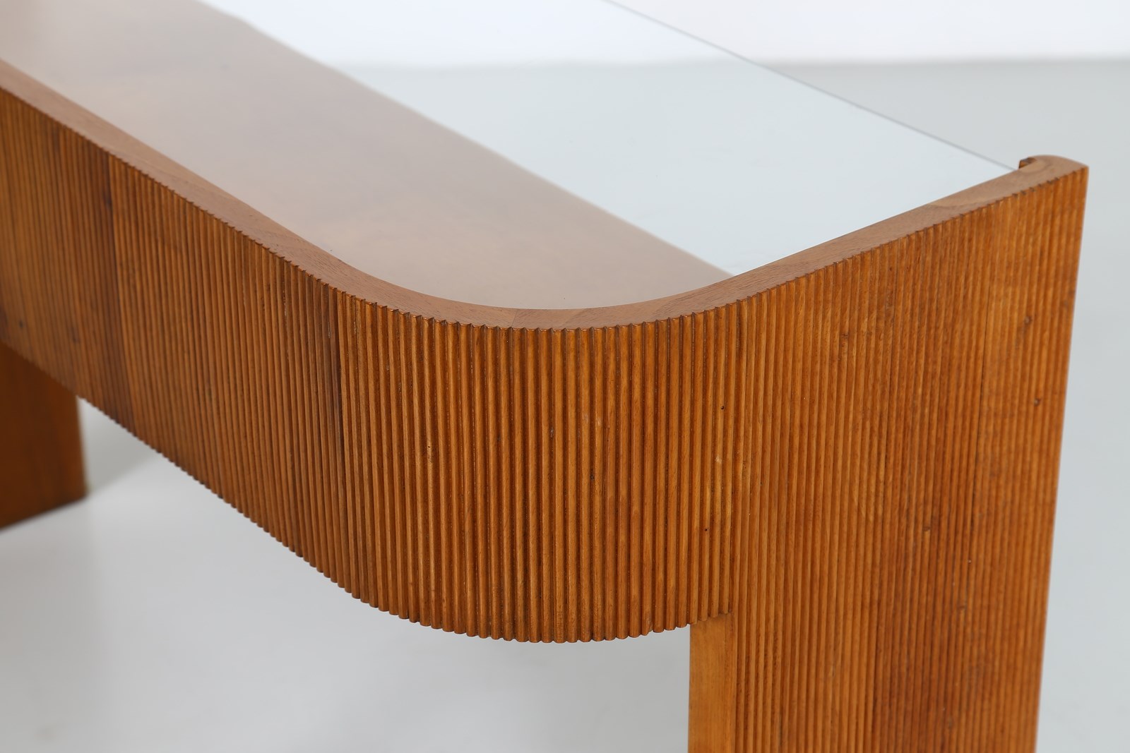 GIO PONTI (1891 – 1979) e LUIGI SCREMIN (1896 - 1983) (attribuito) Toeletta, produzione Fratelli Scremin Belluno, anni 30. Legno di noce, cristallo molato e ottone.. Cm 120,00 x 140,00 x 40,00.