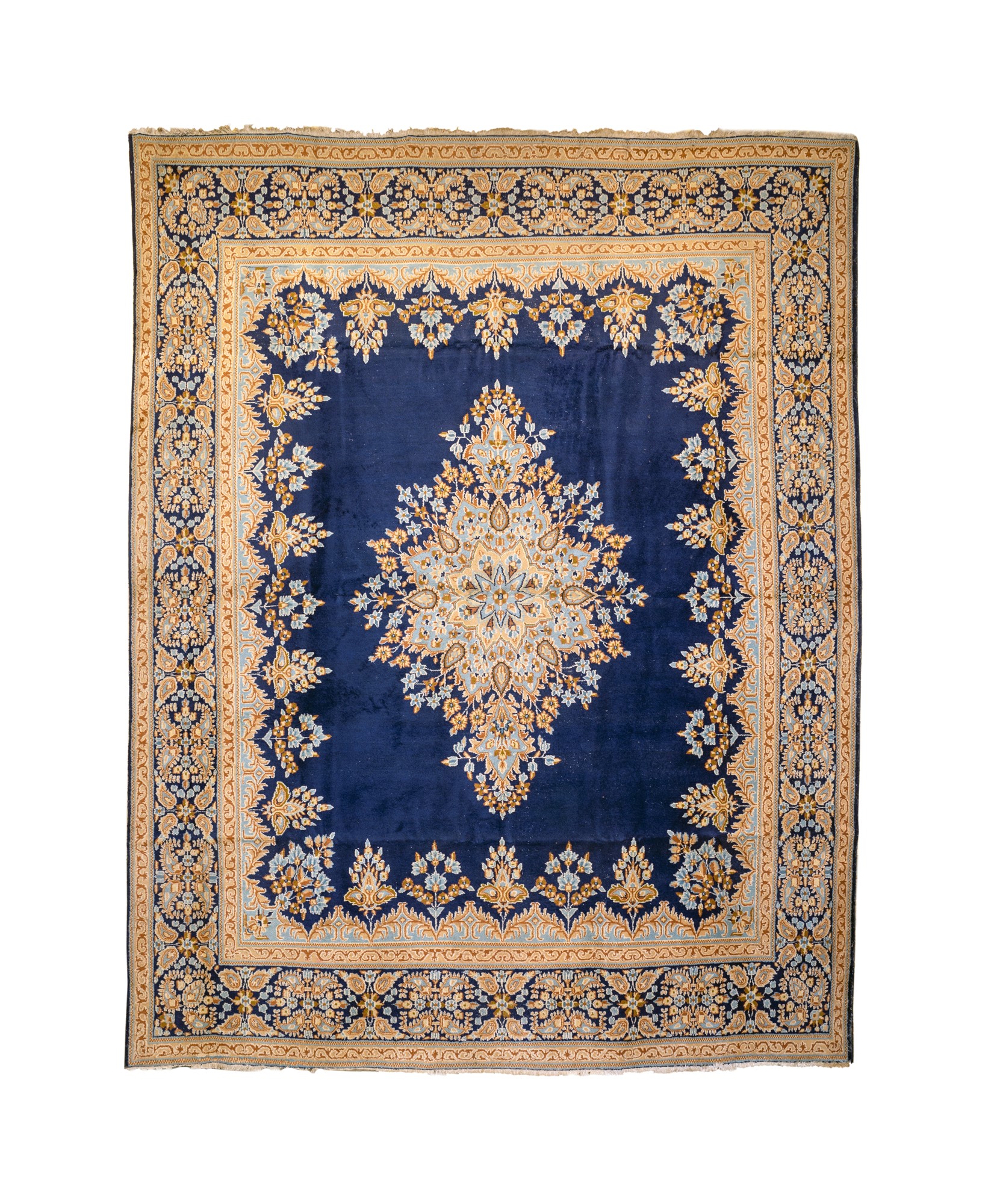 Tappeto orientale fondo blu - con medaglione fiorito centrale in forma di losanga ed ampia bordura nei medesimi toni cromatici del celeste e nocciola. cm 389x302