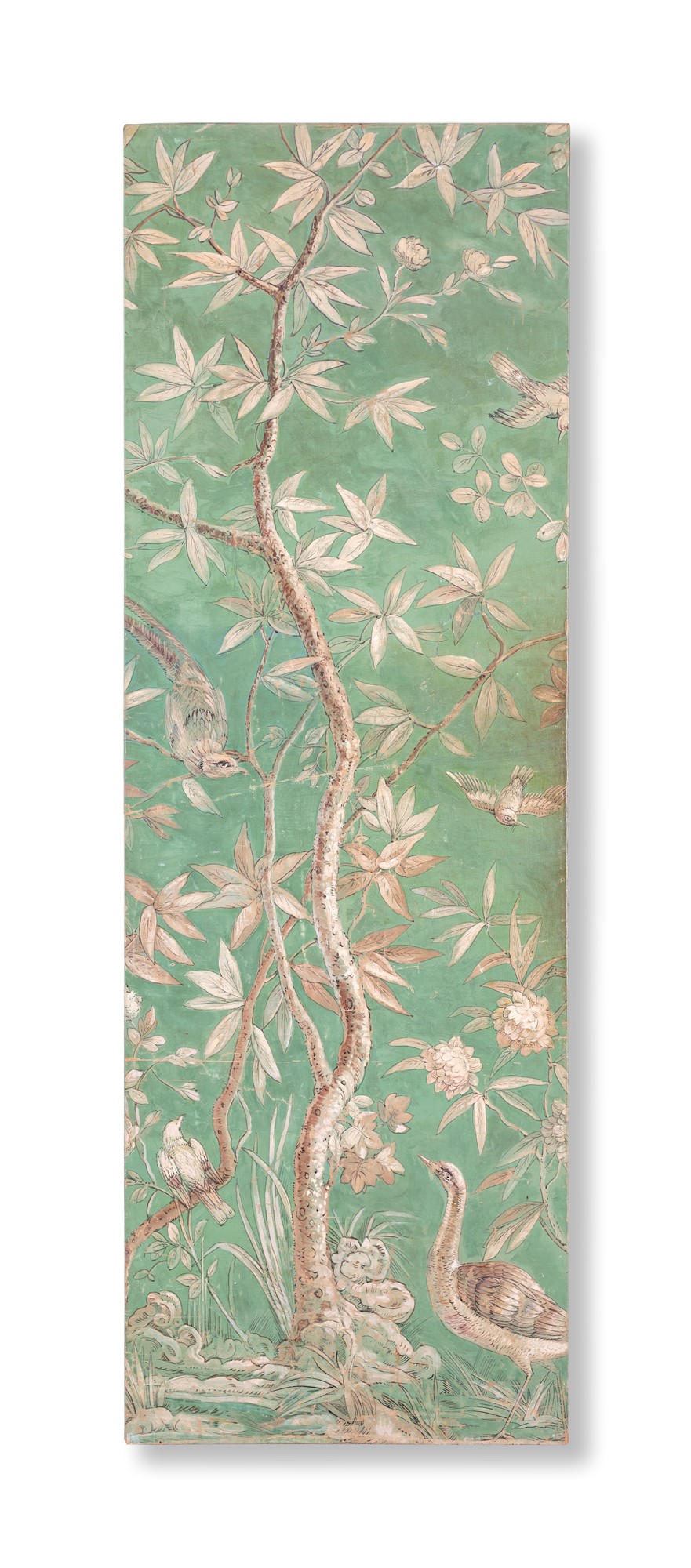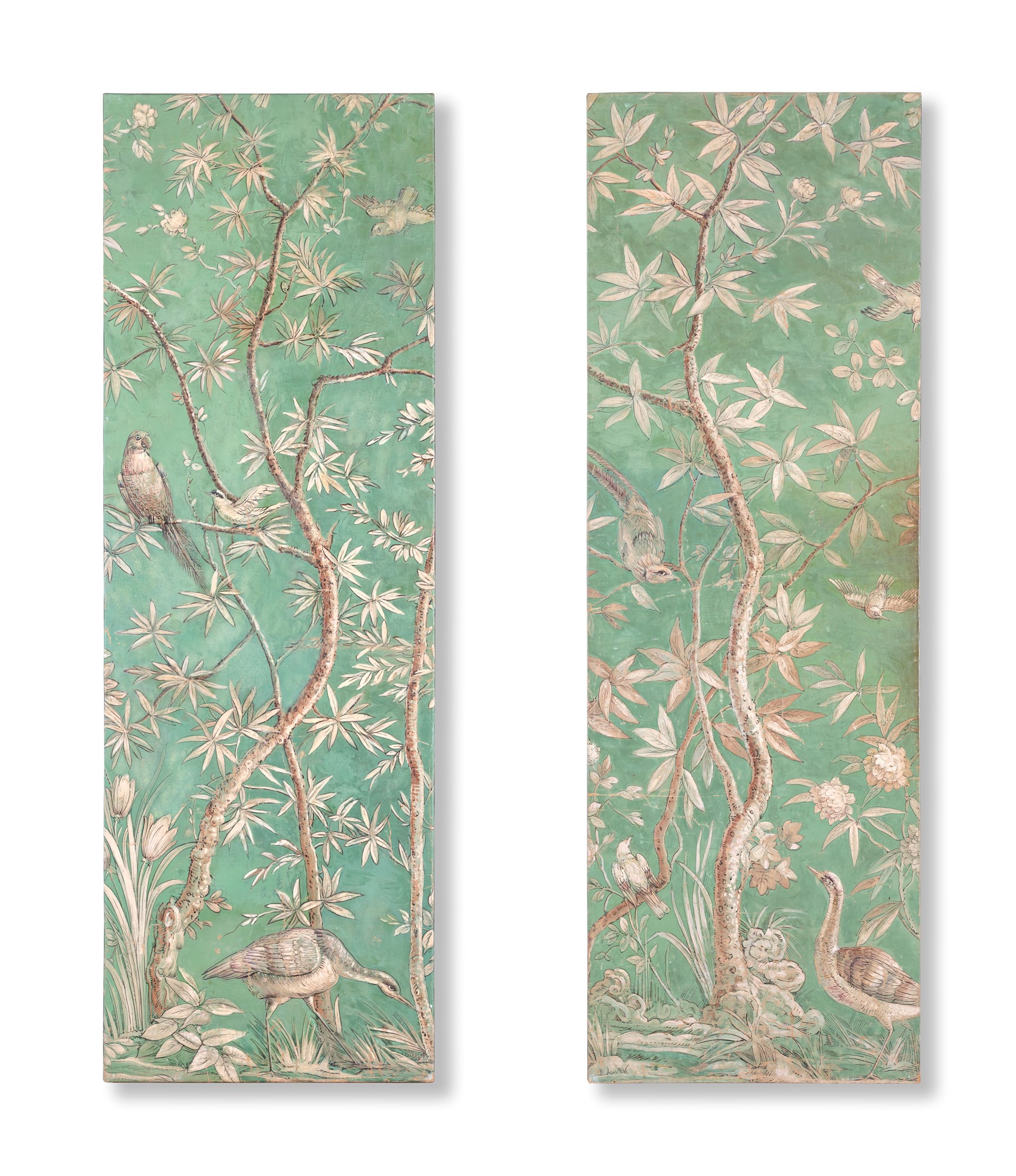 Coppia di pannelli decorativi, seconda metà del XVIII secolo - realizzati in seta fondo verde applicata su tavola, decorata a motivi naturalistici animati da figure di volatile en grisaille. cm 196x65