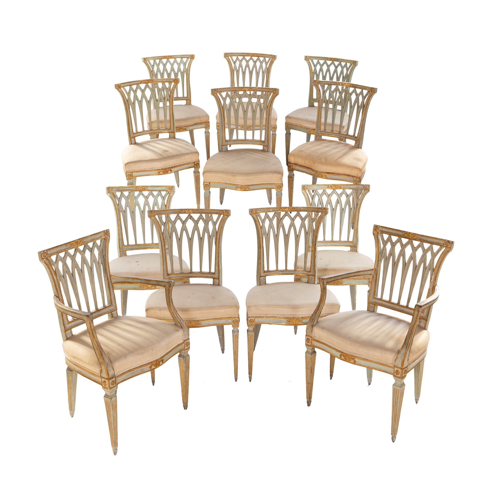 Coppia di poltrone e dieci sedie in legno laccato, Toscana, fine XVIII secolo. dorate lungo i profili ed i rilievi ornamentali; schienali a giorno di linea squadrata con archetti ad ogiva, sedili imbottiti, gambe rastremate. cm 90x58x45