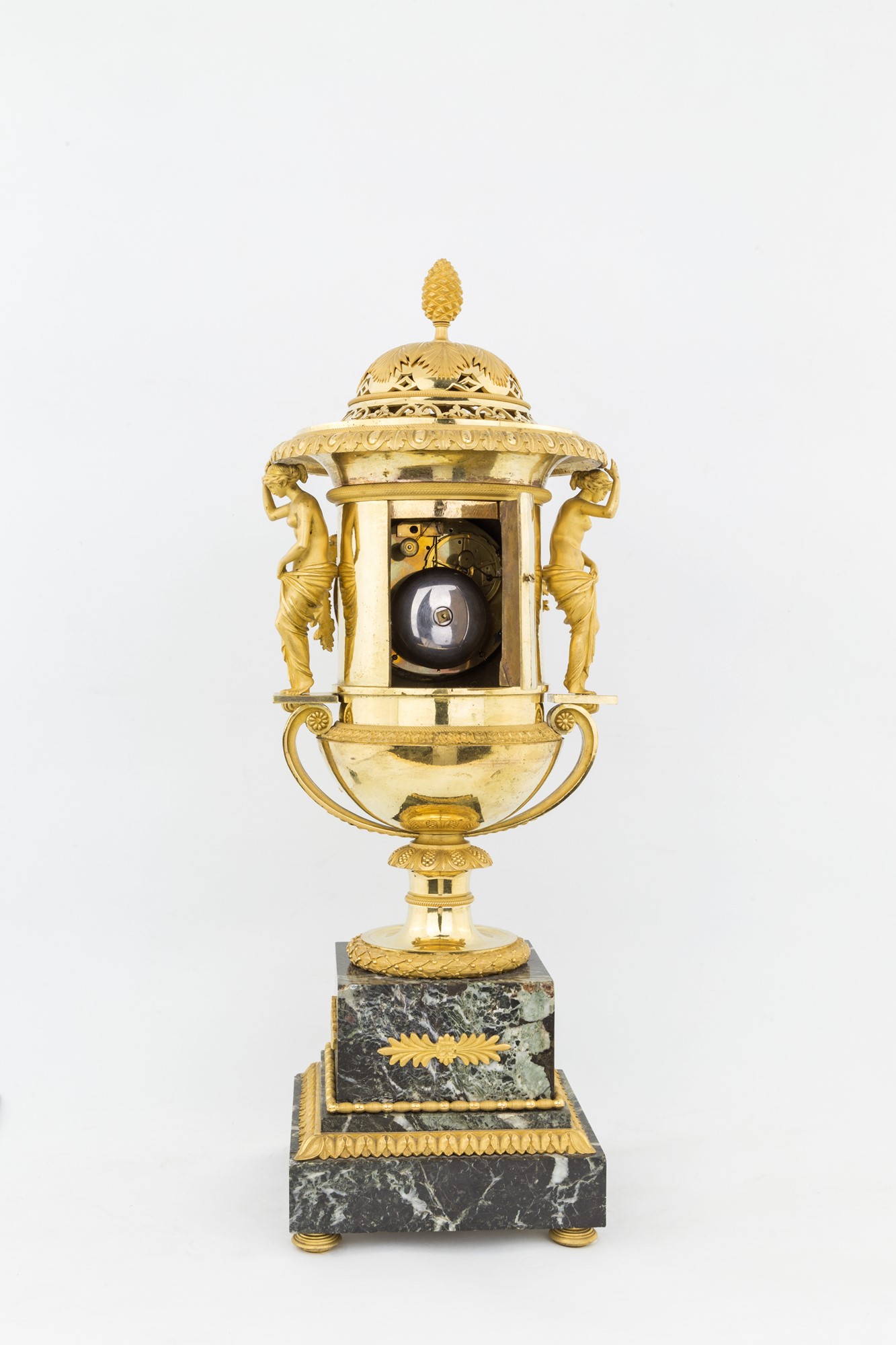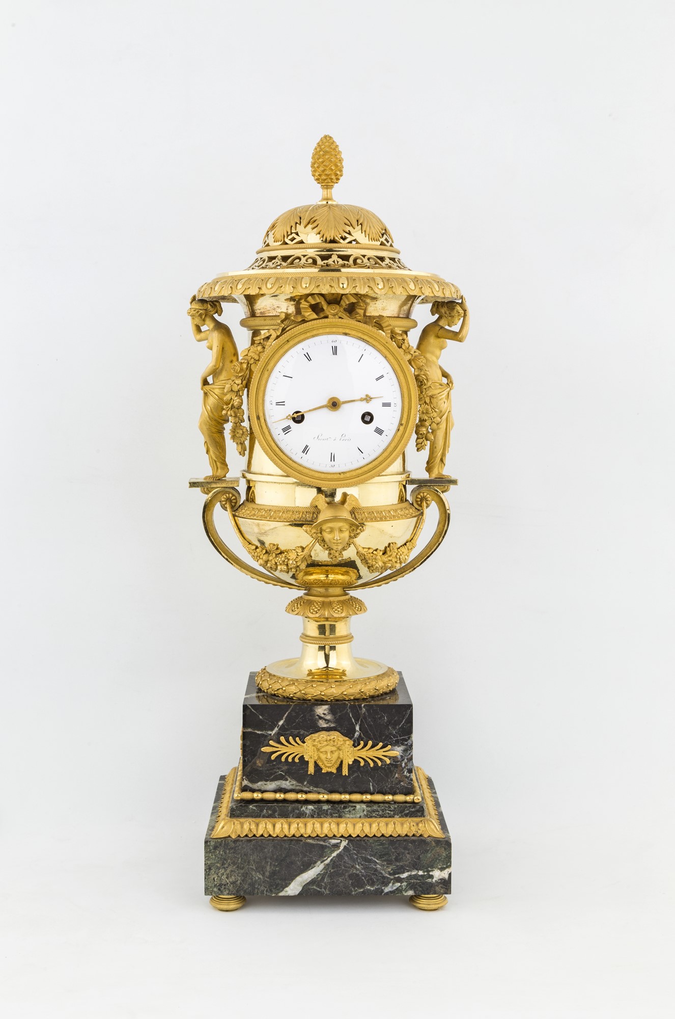 Grande orologio in bronzo dorato, Francia, epoca del Direttorio. cm 58x18x18 "in forma di vaso Medici impreziosito da fregi naturalistici di gusto neoclassico e caratterizzato da figure muliebri poste sulle anse; queste si dipartono dall'attaccatura del piede alla base del vaso guarnita da volto di Mercurio fra ghirlande minuziosamente cesellate. Coperchio a cupolino in parte traforato sormontato da una pigna, base squadrata in marmo abbellita frontalmente da mascherone. Movimento a doppio bariletto con sospensione di seta e campana realizzato dall'orologiaio parigino Sirost (come da firma sul quadrante), che aveva la sua attività in Rue Bertin-Poiré tra il 1806-1810 e successivamente in Rue des Fontaines nel 1840.
