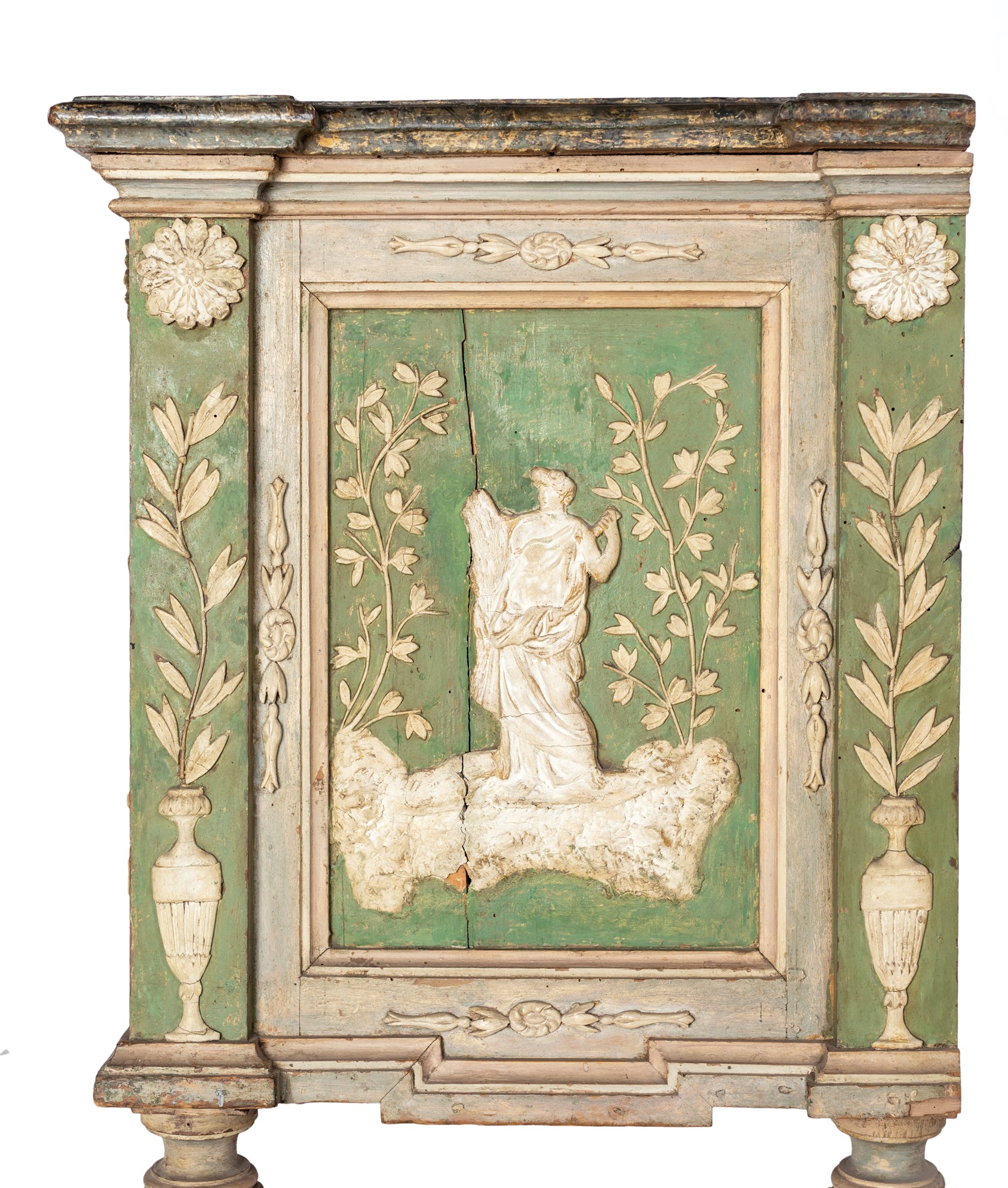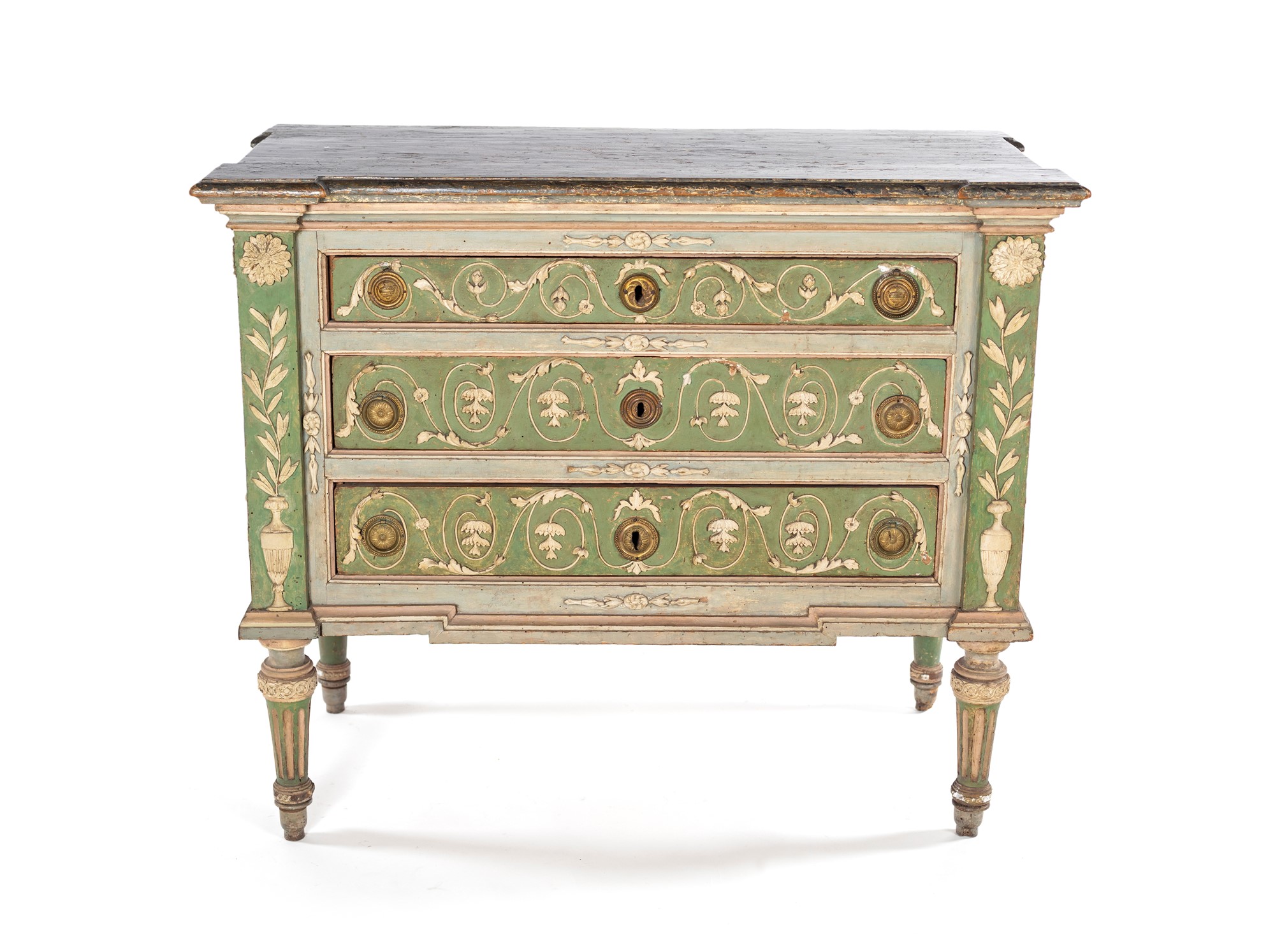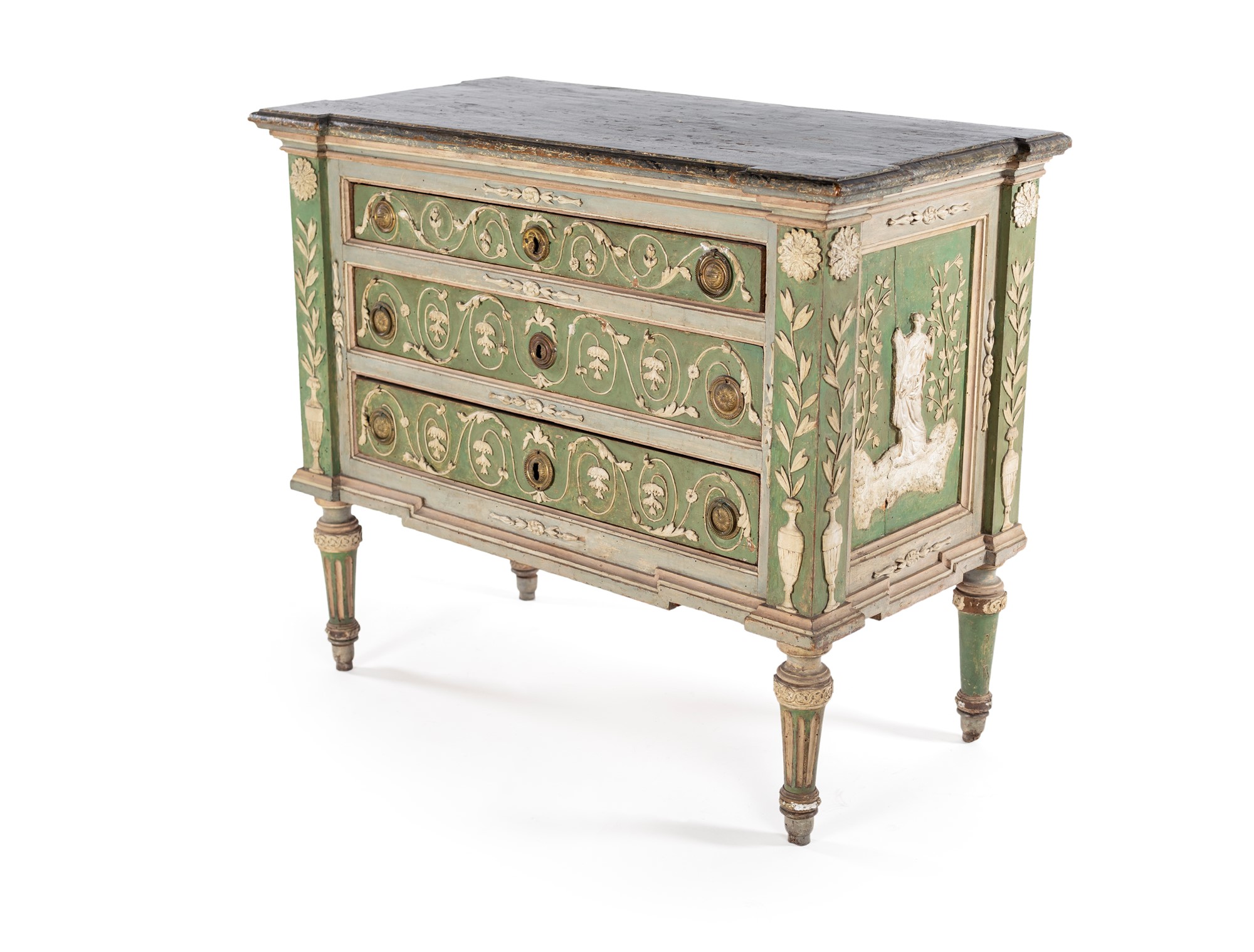 Cassettone in legno laccato, Piemonte, bottega di Giuseppe Maria Bonzanigo - con specchiature decorate a motivi naturalistici e figure mitologiche emergenti dal fondo verde pastello; tre cassetti frontali con maniglie in bronzo, piedi rastremati. Piemonte XVIII secolo. cm 90x114x56