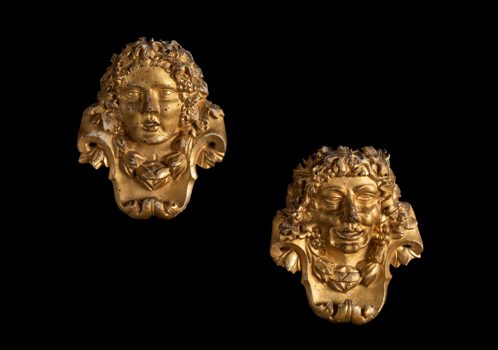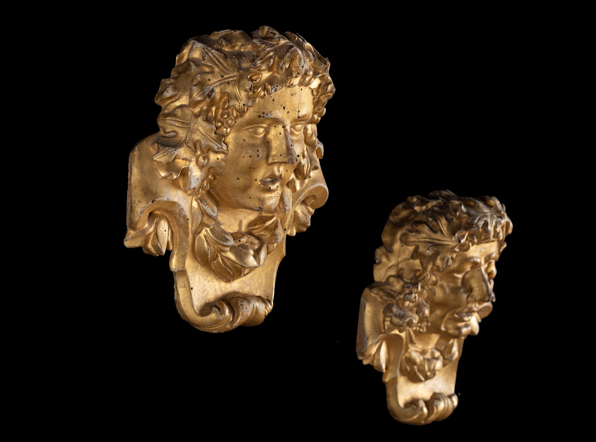 Coppia di mascheroni in legno dorato, fine del XVIII secolo - scolpiti in forma di Bacco giovane e in età matura; i volti sono sottolineati da una ghirlanda vegetale ed emergono da un cartiglio con orli ripiegati. cm 30x26x12