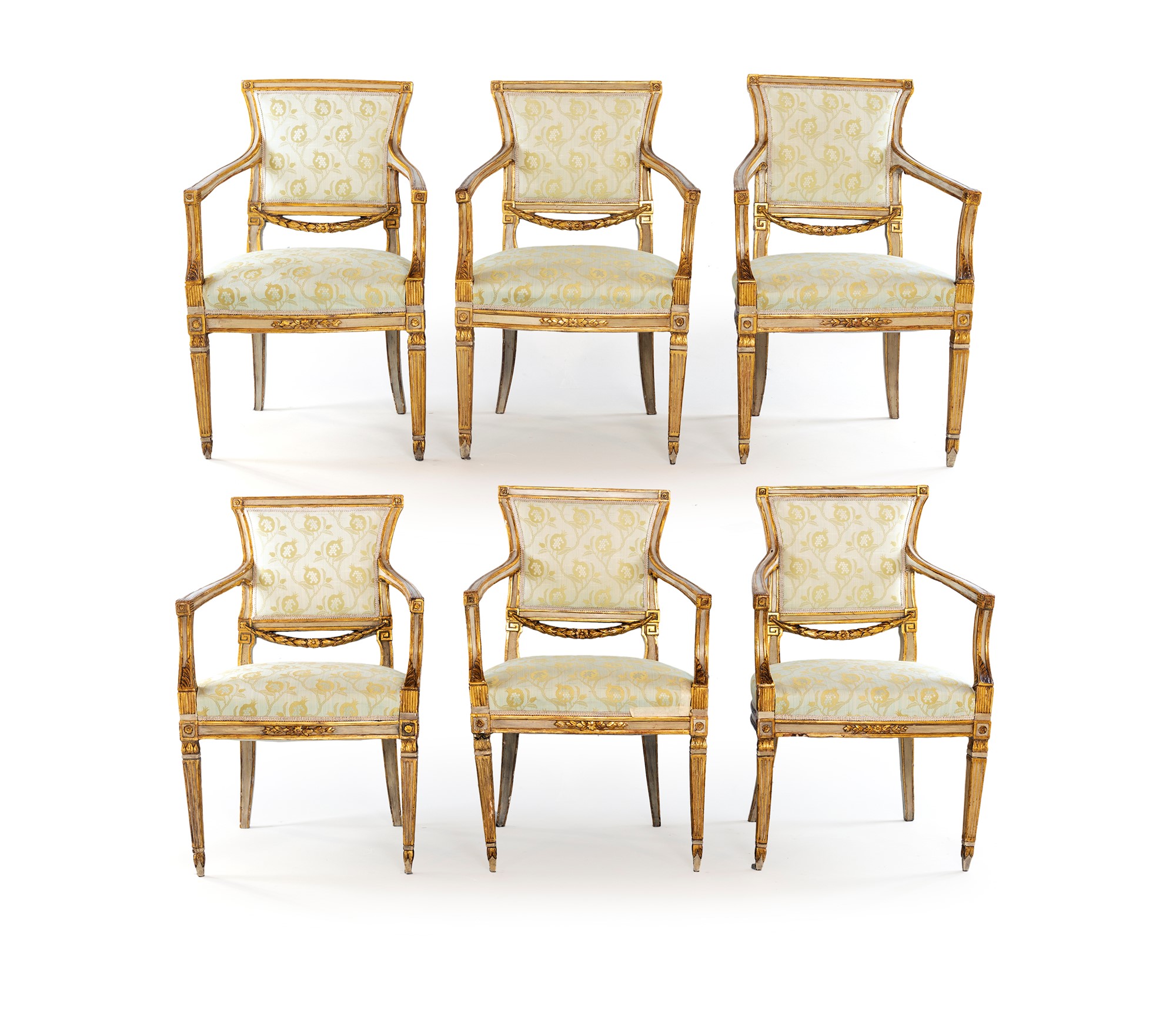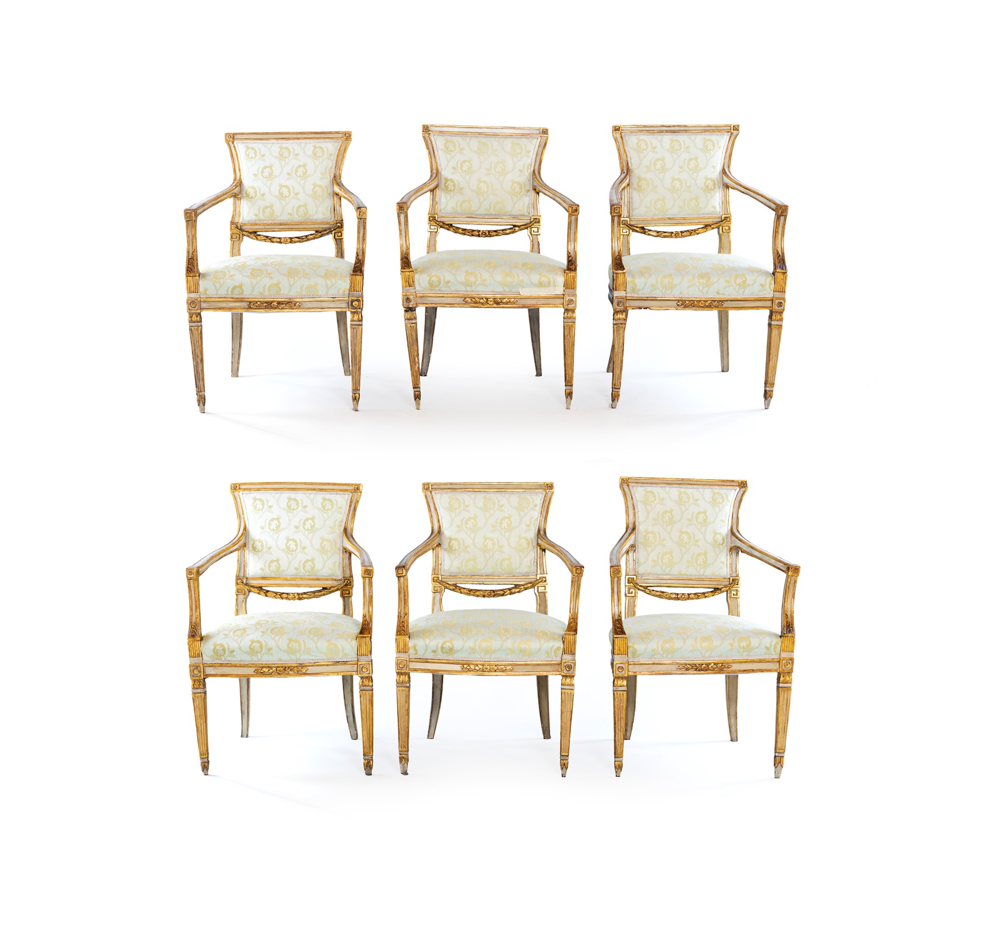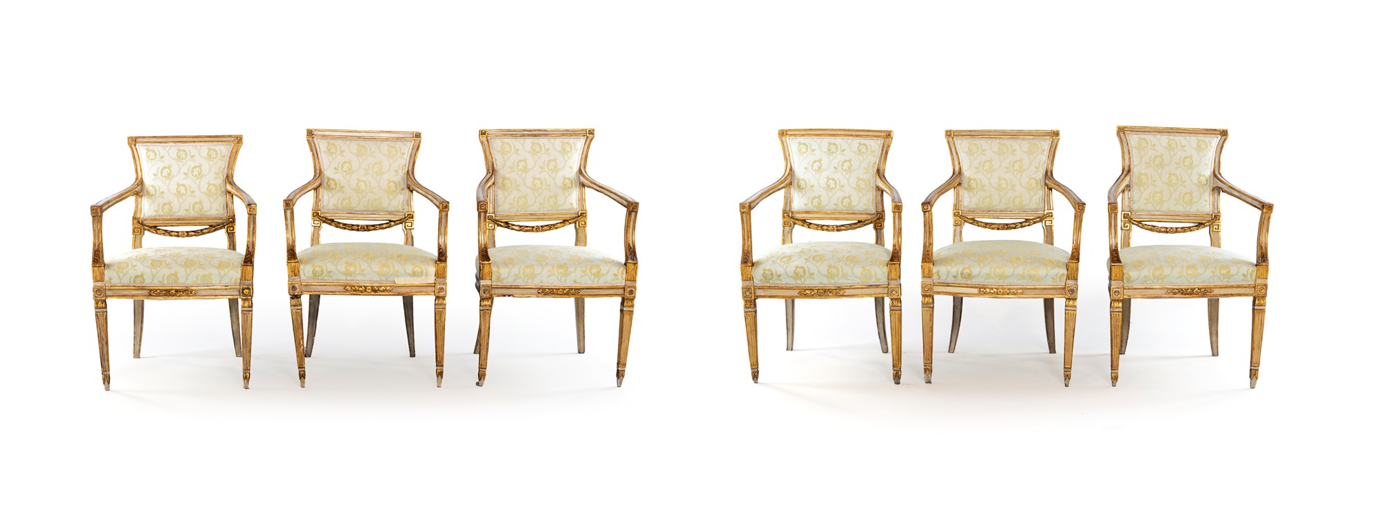 Sei poltrone in legno laccato bianco e oro, Napoli fine del XVIII secolo - con cornici squadrate impreziosite da rosette angolari intagliate e dorate; schienali imbottiti sottolineati da fregio in forma di ghirlanda; sedili imbottiti, braccioli lineari e gambe rastremate scanalate. cm 90,5x57x49