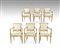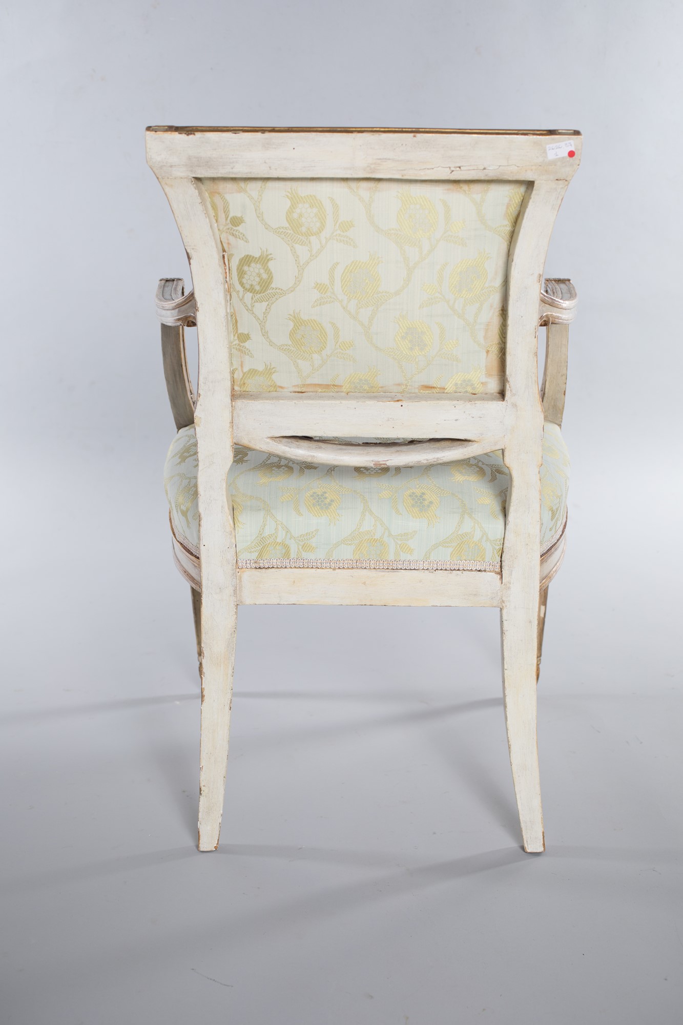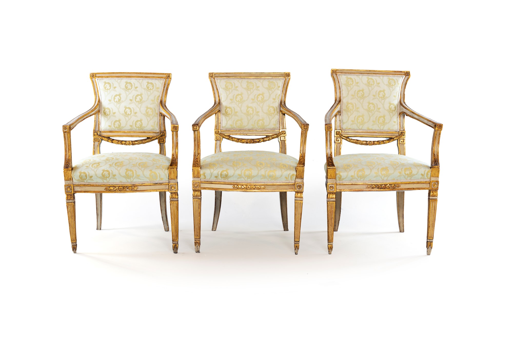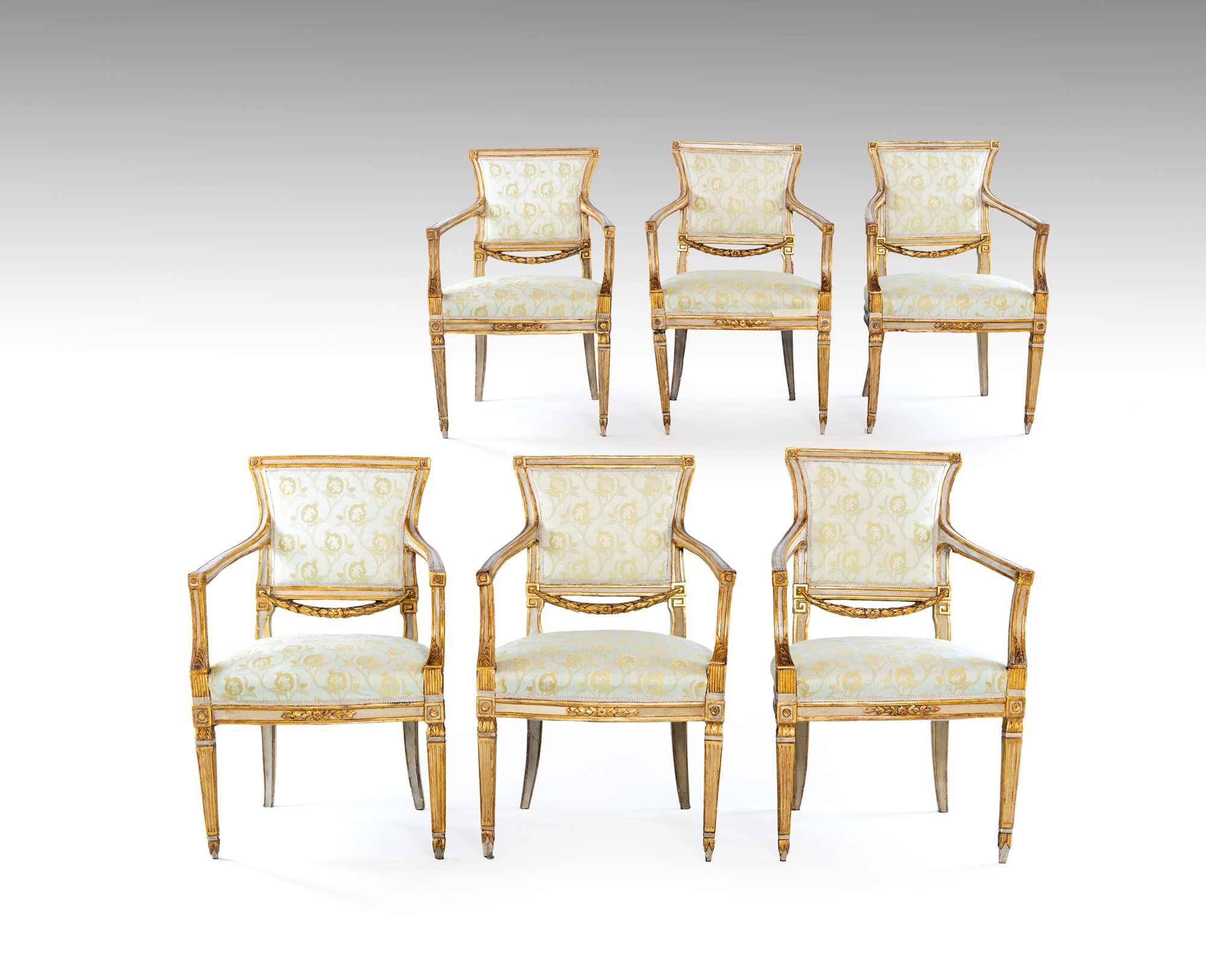 Sei poltrone in legno laccato bianco e oro, Napoli fine del XVIII secolo - con cornici squadrate impreziosite da rosette angolari intagliate e dorate; schienali imbottiti sottolineati da fregio in forma di ghirlanda; sedili imbottiti, braccioli lineari e gambe rastremate scanalate. cm 90,5x57x49