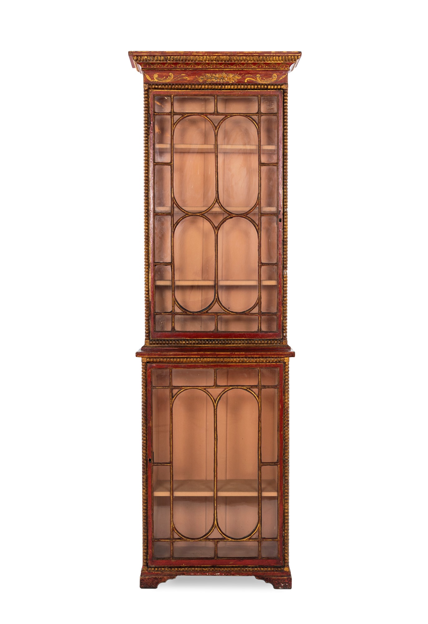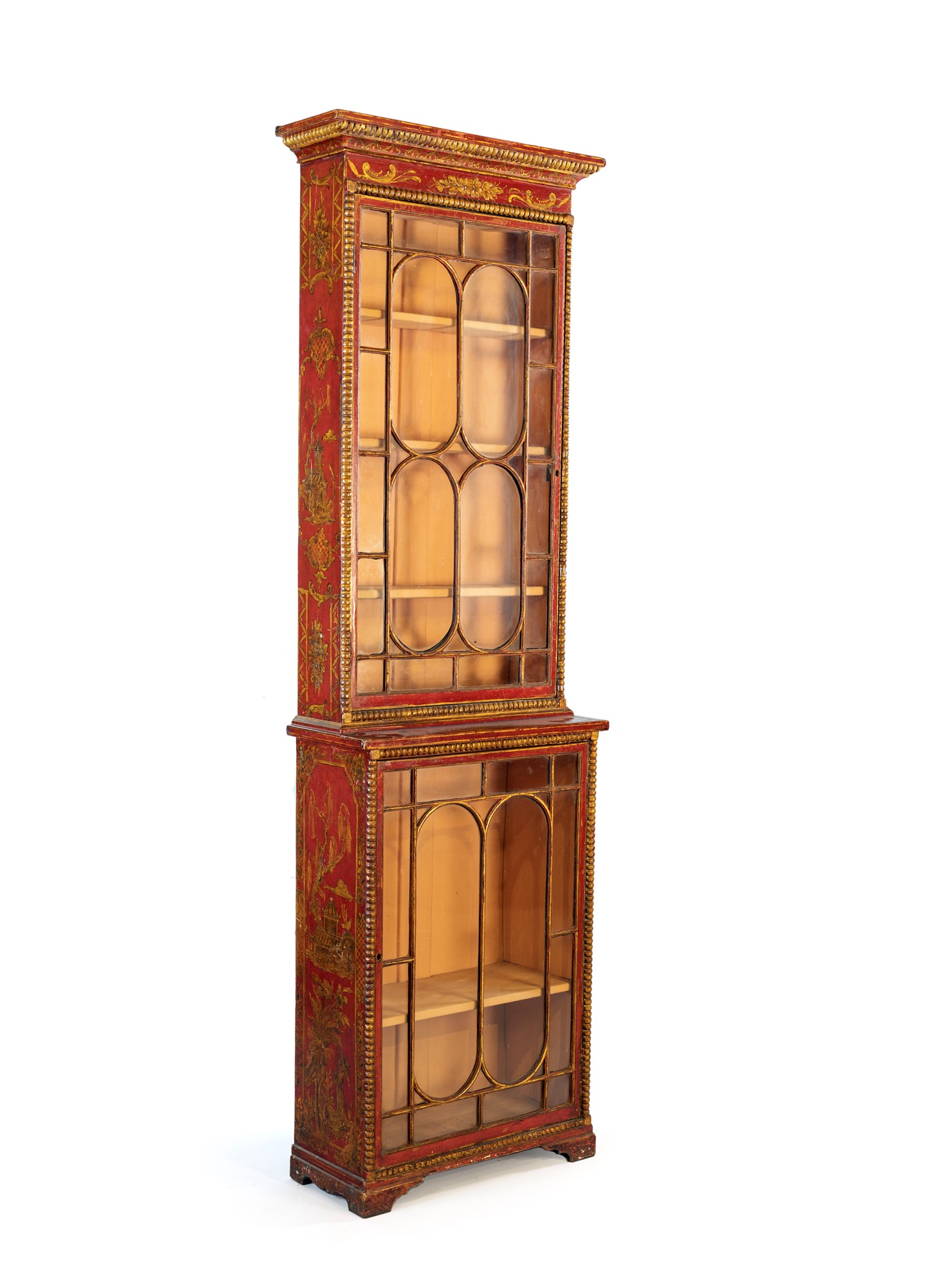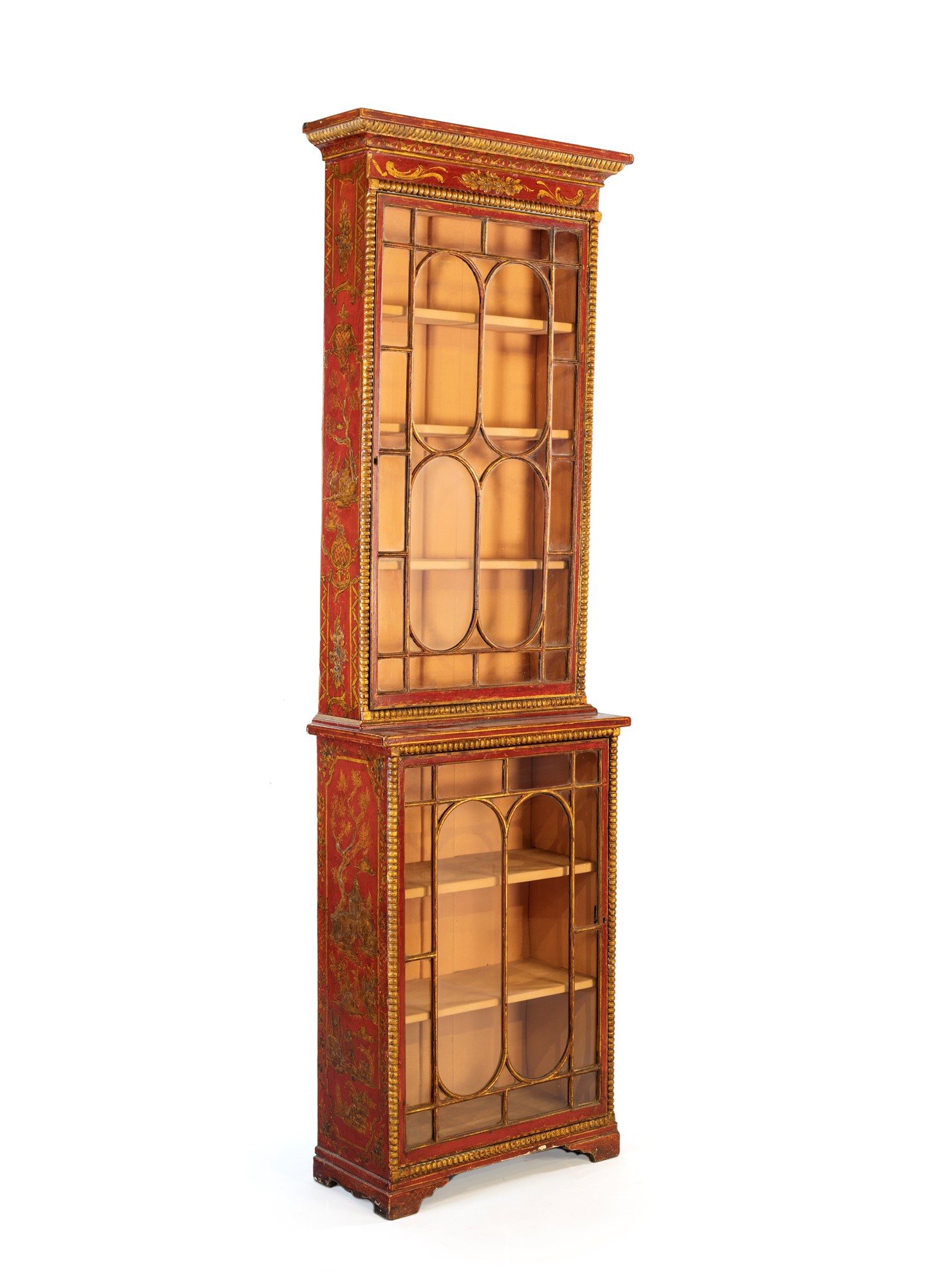 Coppia di vetrine a due corpi in legno laccato, Piemonte, XVIII secolo - decorate a chinoiséries dorate su fondo rosso; facciata incorniciata da perlinatura e ante con riquadri geometrici; piedi a mensola. cm 215x63x28,5