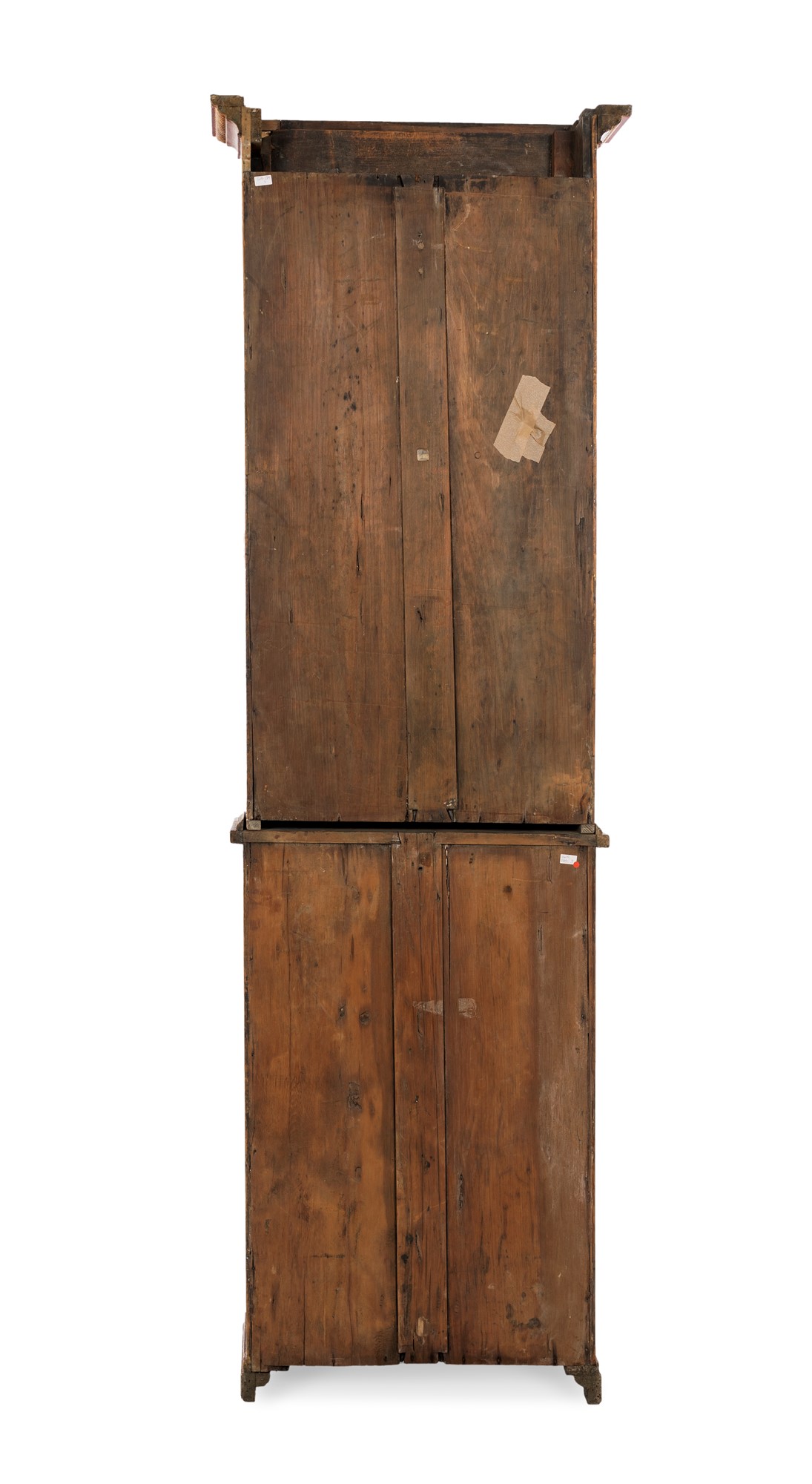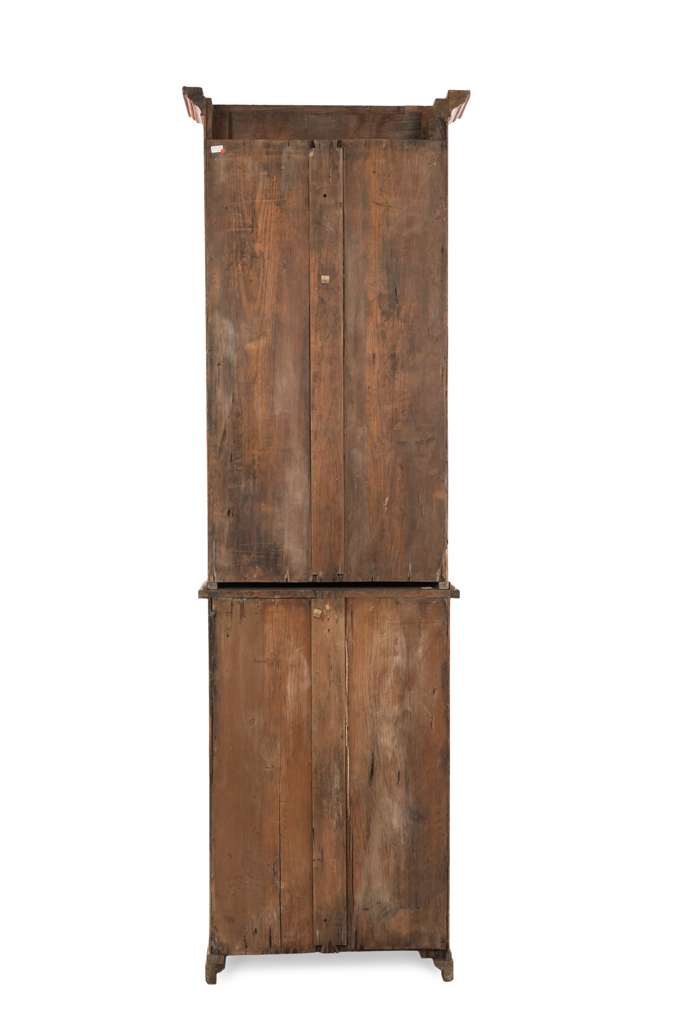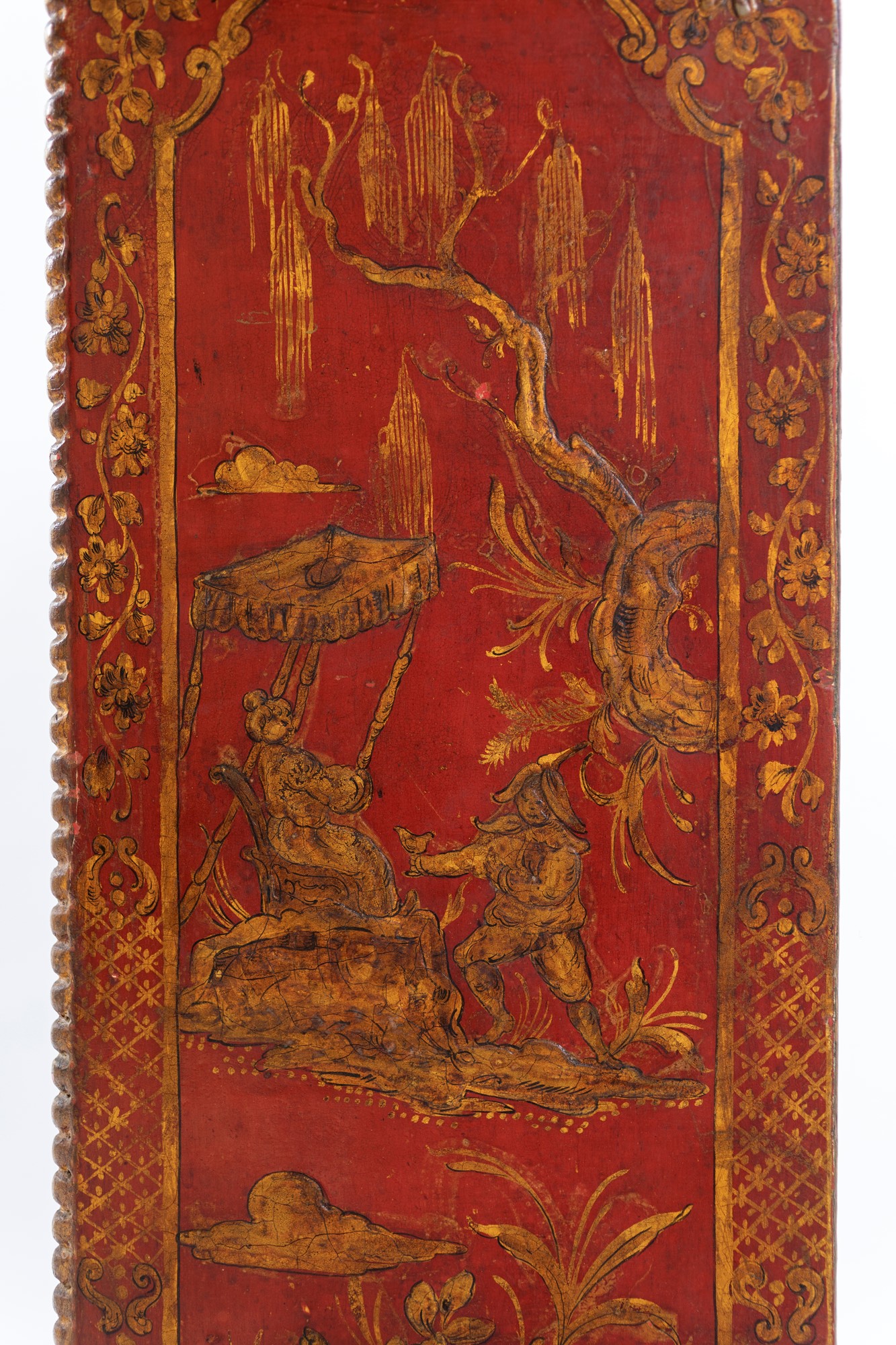 Coppia di vetrine a due corpi in legno laccato, Piemonte, XVIII secolo - decorate a chinoiséries dorate su fondo rosso; facciata incorniciata da perlinatura e ante con riquadri geometrici; piedi a mensola. cm 215x63x28,5