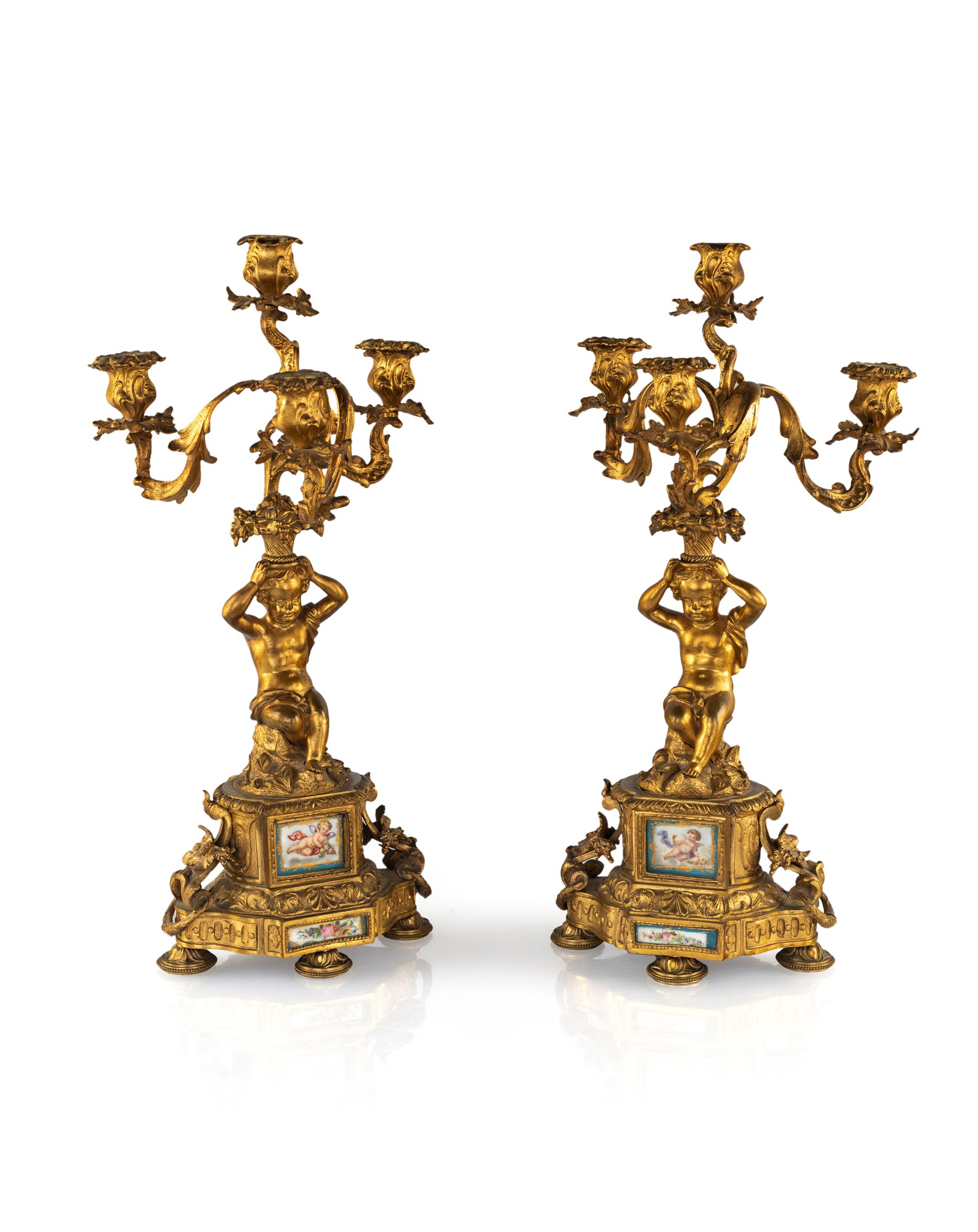 Coppia di candelabri in bronzo dorato, Francia, XIX secolo - a quattro luci disposte su bracci variamente ricurvi emergenti da ceste sorrette da figure di amorino; basi abbellite da placchette in porcellana policroma. altezza cm 55