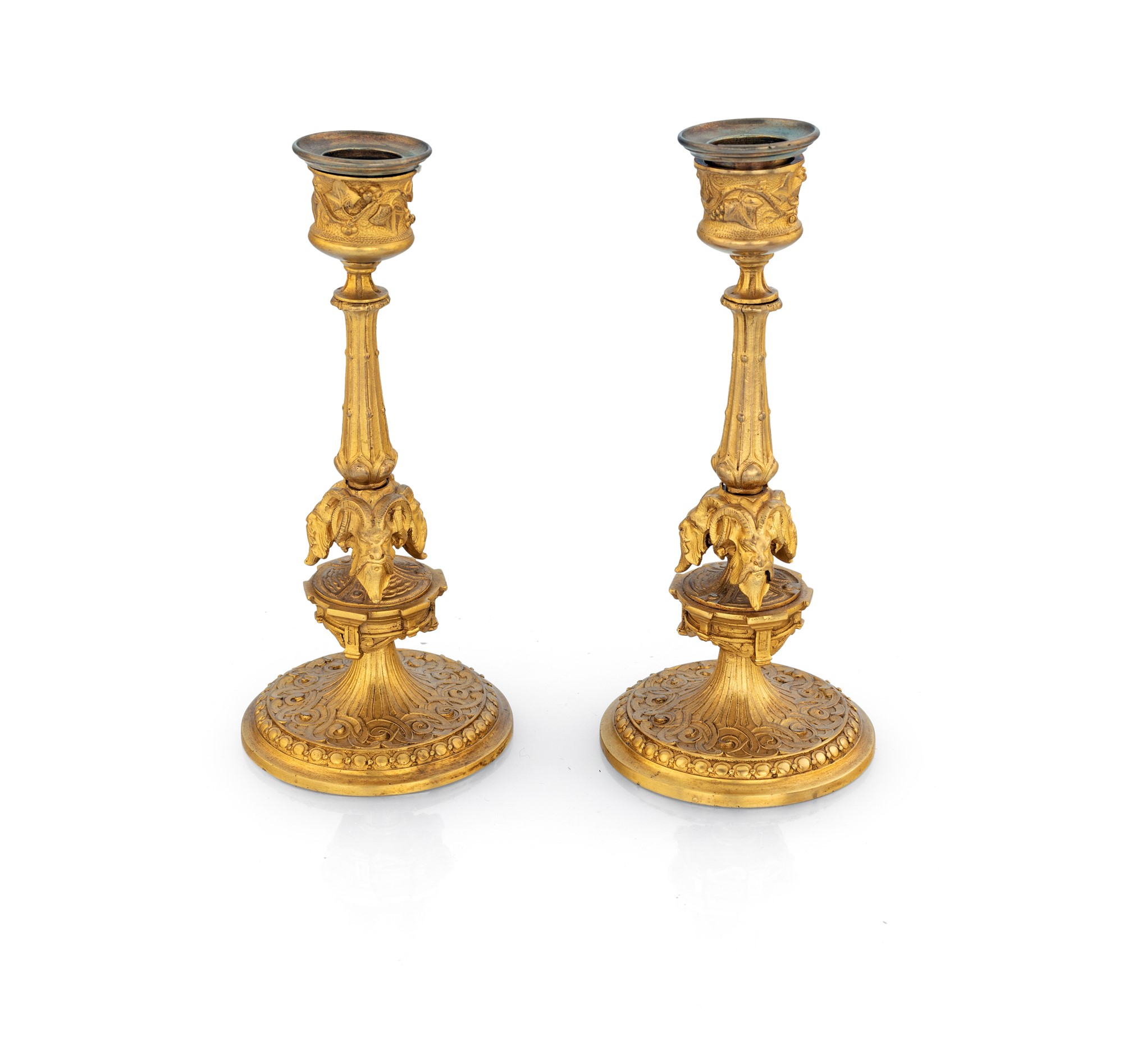 Coppia di piccoli candelieri in bronzo dorato, Francia, XIX secolo - con fusti rudentati emergenti da tre teste di satiro; reggicandela a vaso ornato da tralci di vite, basi circolari cesellate a volute con profilo esterno abbellito da perlinatura. Siglati A.D. altezza cm 19
