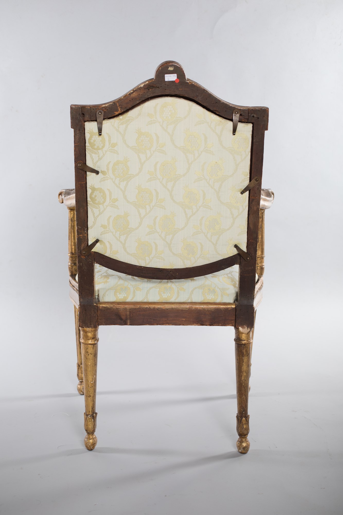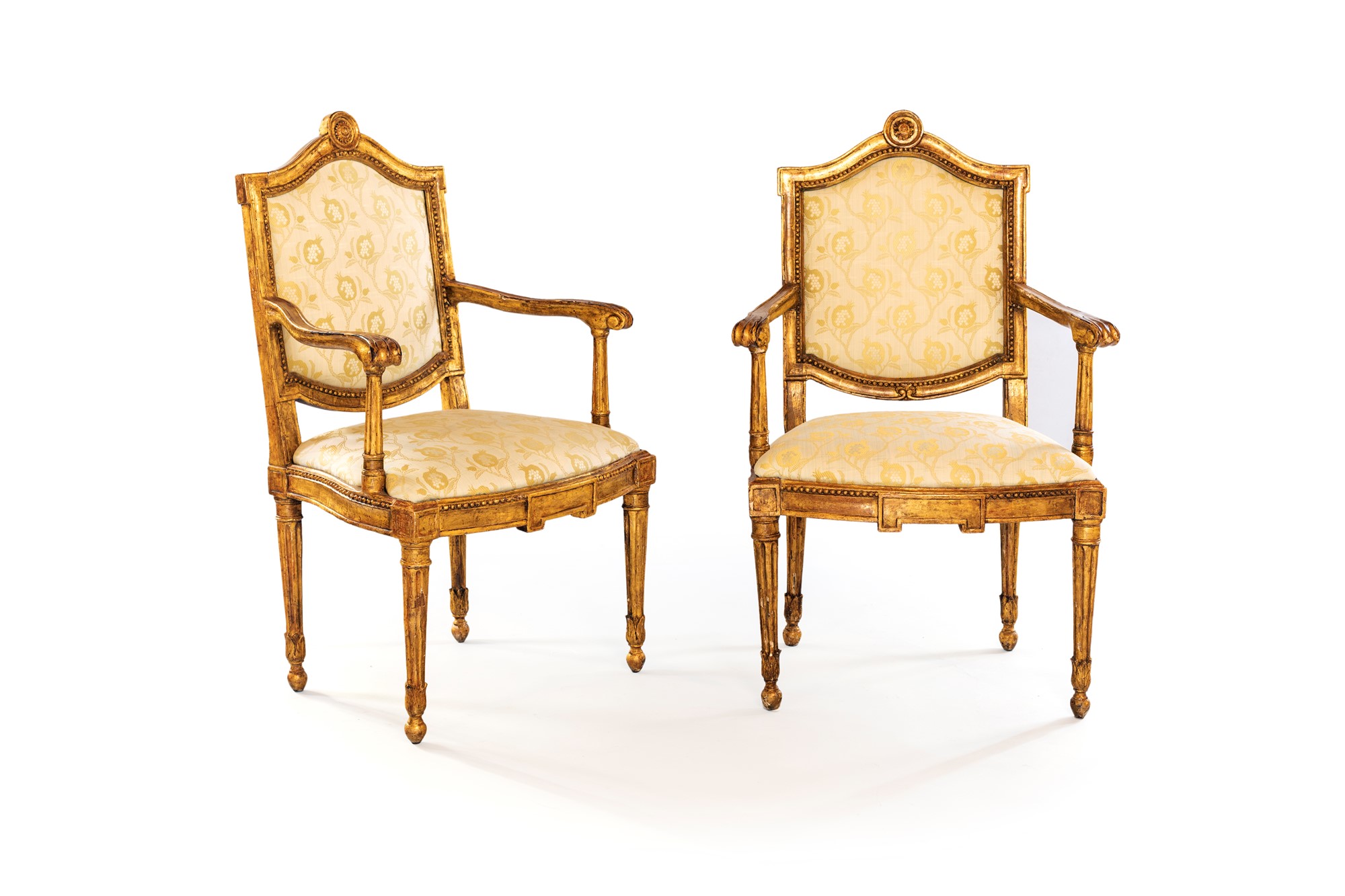 Coppia di poltrone in legno dorato, Roma XVIII secolo - con schienali arcuati dominati da una corolla intagliata, imbottiti come i sedili; braccioli sagomati terminanti a ricciolo, sostenuti da montanti a colonna; gambe rastremate scanalate. cm 105x58x50