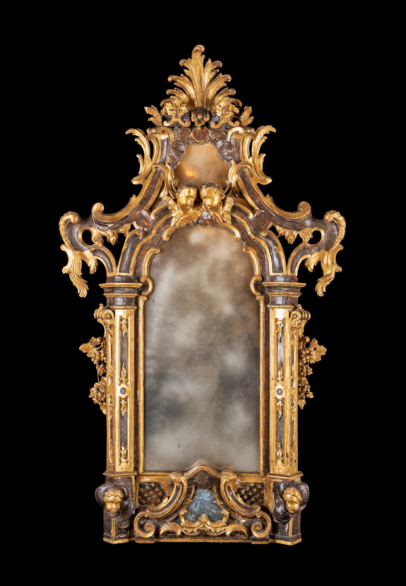 Grande specchiera barocca in legno dorato, Stato Pontificio XVII secolo - con cornice di impostazione architettonica con nicchia centrale sormontata da due teste di cherubino emergenti alla base della cimasa con cartiglio a specchio dominata da una valva; ai lati volute e cartigli da cui discendono grappoli di uva. Difetti - cm 210x125