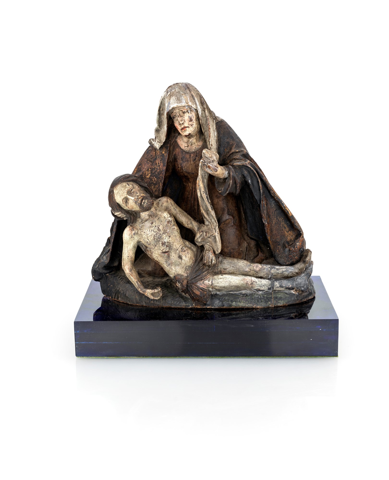 Gruppo scultoreo in legno laccato, Germania XV/XVI secolo - raffigurante Pietà; teca in plexiglass.