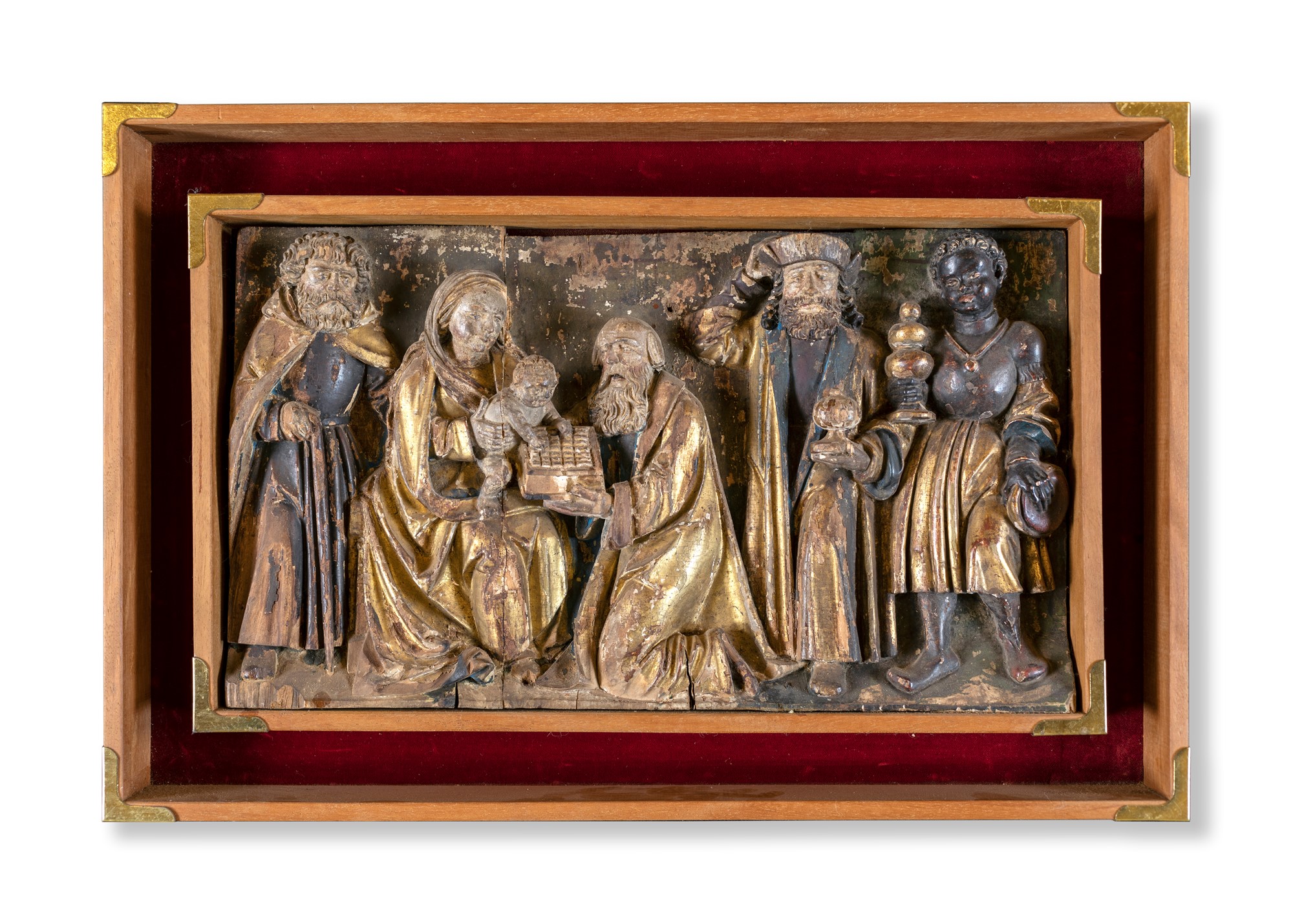 Altorilievo in legno dorato su fondo pigmentato, XVII / XVIII secolo. - raffigurante Sacra Famiglia e i Re Magi. - cm 25x44
