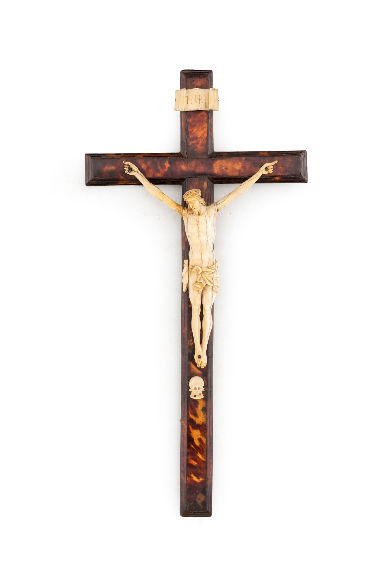 Croce devozionale in legno ebanizzato, Italia meridionale, XVIII secolo - con inserti in tartaruga e figura del Cristo in avorio; al vertice della croce l'insegna con iscrizione e ai piedi della figura un piccolo teschio realizzato in avorio. cm 43x21x5