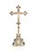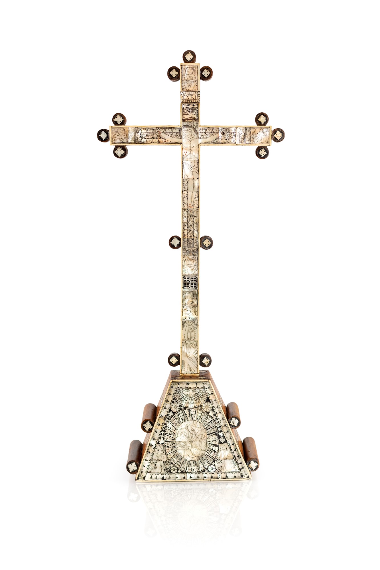 Antico crocifisso da tavolo in legno di pistacchio, ulivo e madreperla - con decorazione minuta eseguita con l'antica tecnica del "tahbiir" iniettando inchiostro sul disegno inciso; la figura del Cristo è sormontata dallo stemma dell'Ordine Francescano e dal titulus crucis; ai suoi piedi la croce di Gerusalemme, il Redentore risorto e la Vergine Addolorata; alle estremità della croce sono raffigurati gli Evangelisti. Base trapezoidale centrata da Annunciazione entro ovale racchiuso da raggiera e due figure di Santi. Reca sul fondo le lettere F F riconducibili alla manifattura dei Frati Francescani che dal Cinquecento hanno testimoniato la loro presenza in Terra Santa introducendo l'uso della madreperla per la produzione di piccoli e grandi oggetti di artigianato betlemita. cm 58x18x10,5