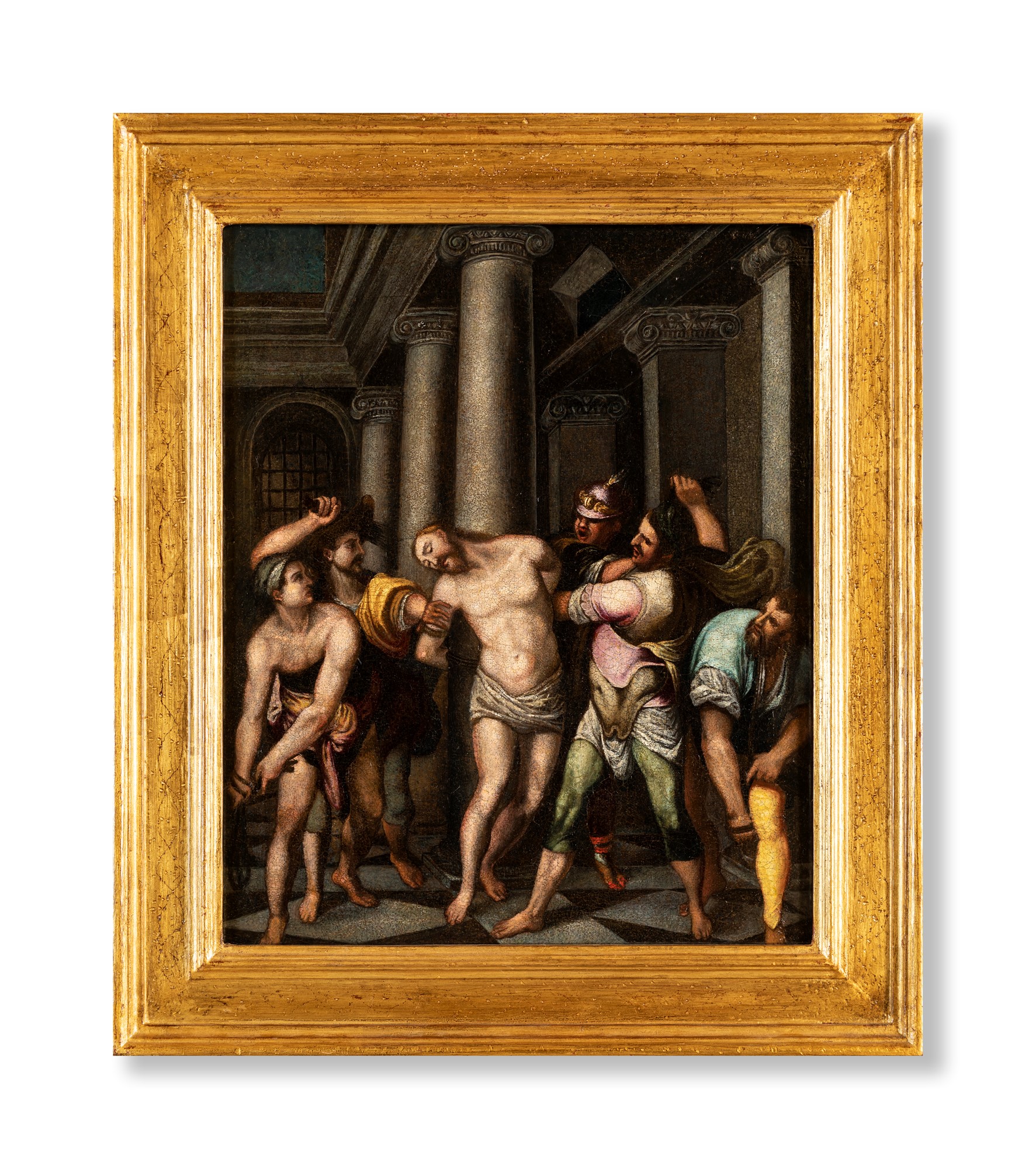 Flagellazione - Molto probabilmente l'opera proposta, di pur notevole qualità, è stata dipinta avendo a modello un'incisione dell'originale, poiché oltre alla specularità sono dissimili le cromie. cm 48x39