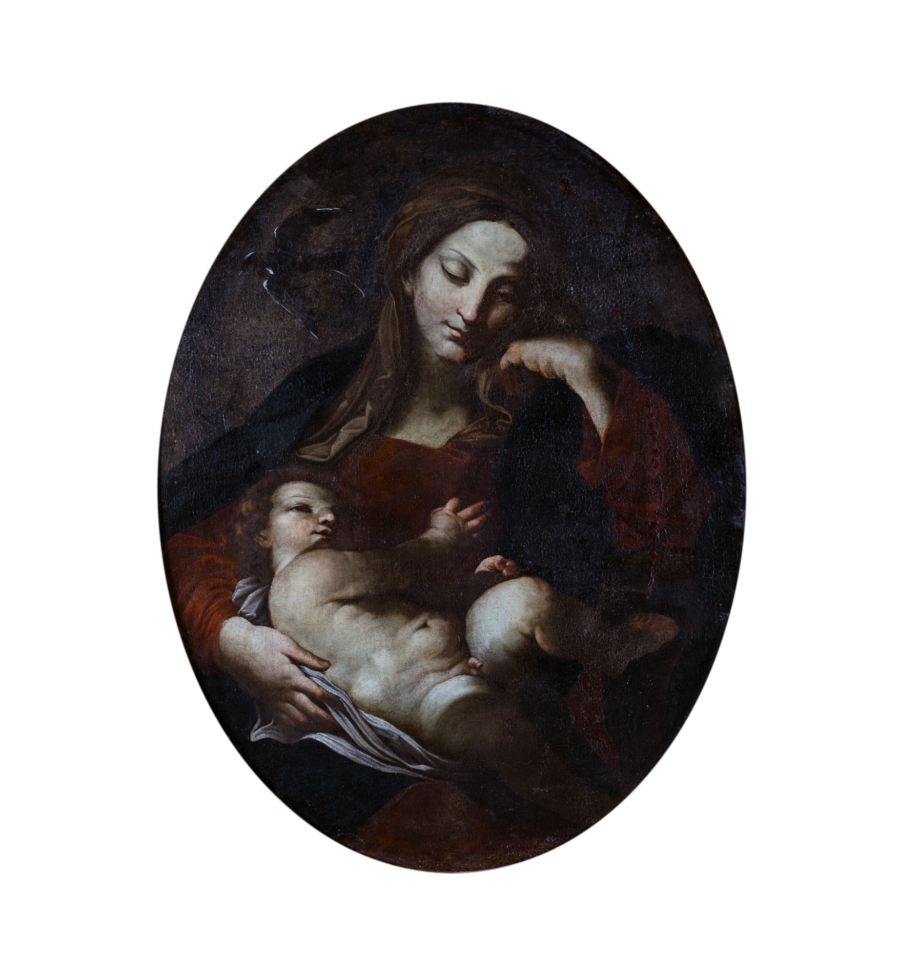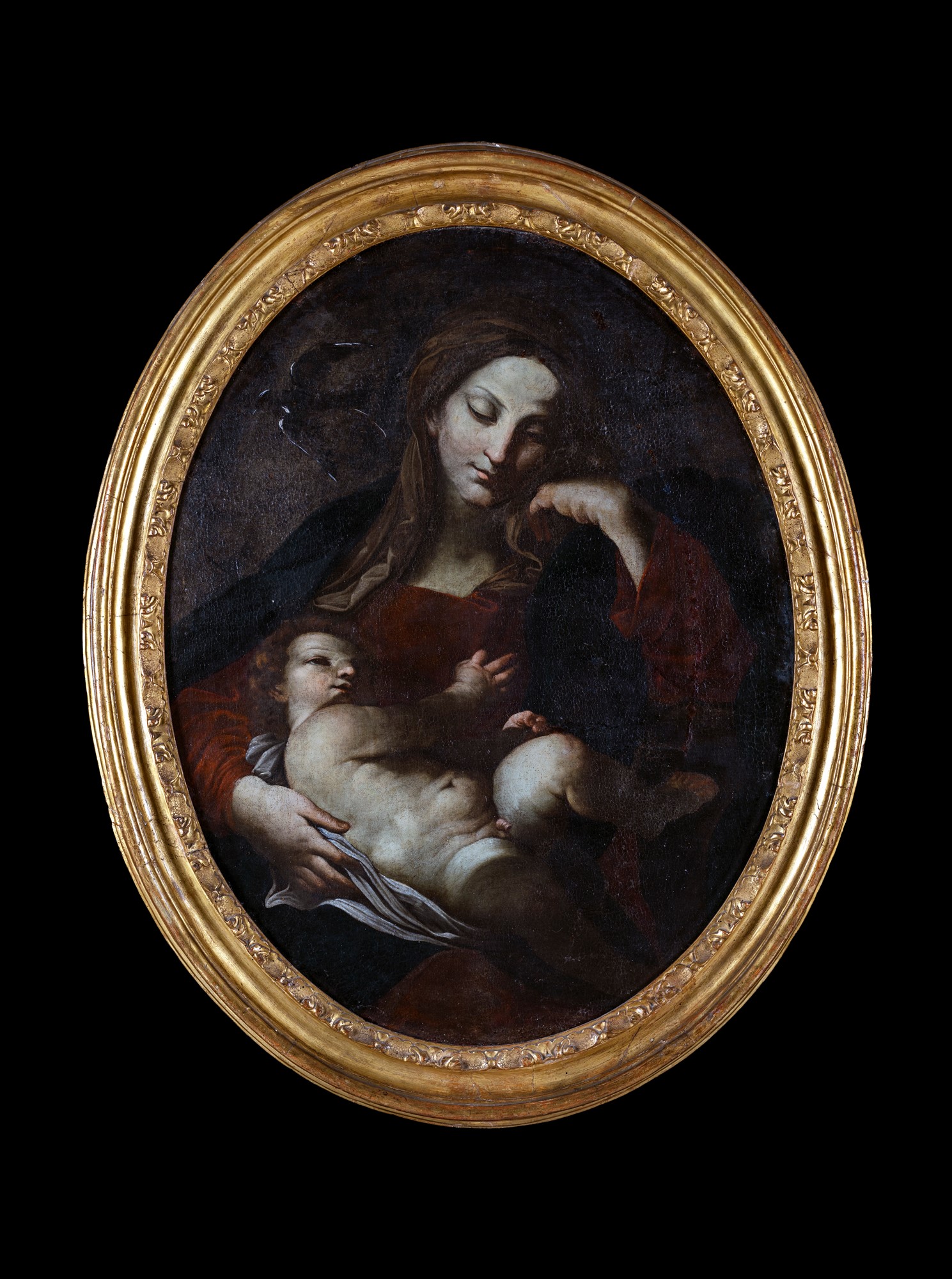 Madonna col Bambino - cm 100x75 - "Il dipinto proposto denuncia i caratteri tipici della pittura di Domenico Piola, individuato dagli studiosi come l'esponente di maggior prestigio della pittura genovese del secondo '600, a capo di una vasta e prolifica bottega che andò monopolizzando il mercato e gli esiti figurativi d'area ligure (soprattutto in seguito al vuoto lasciato dalla morte di Valerio Castello nel 1659).