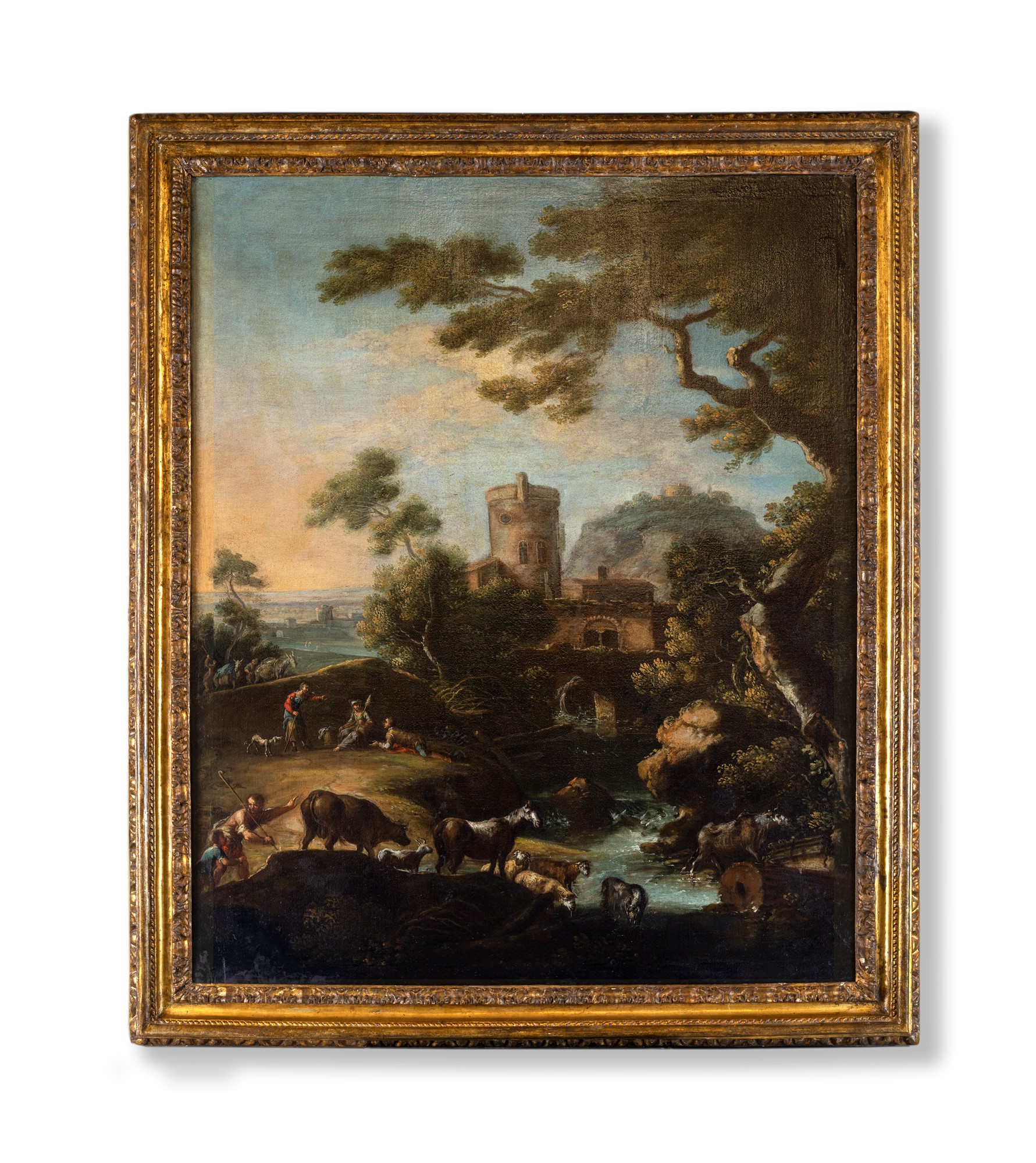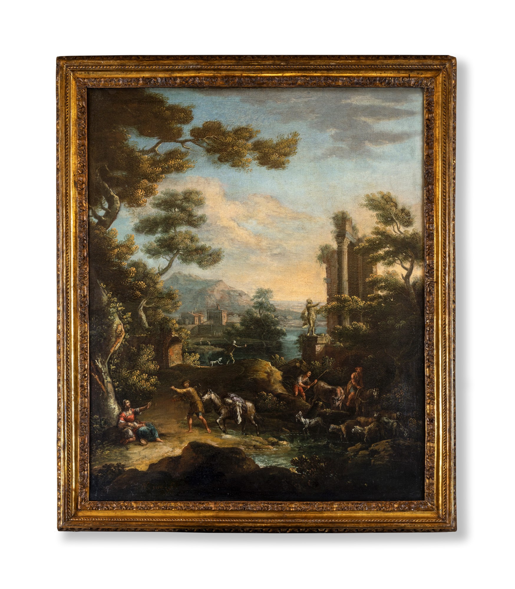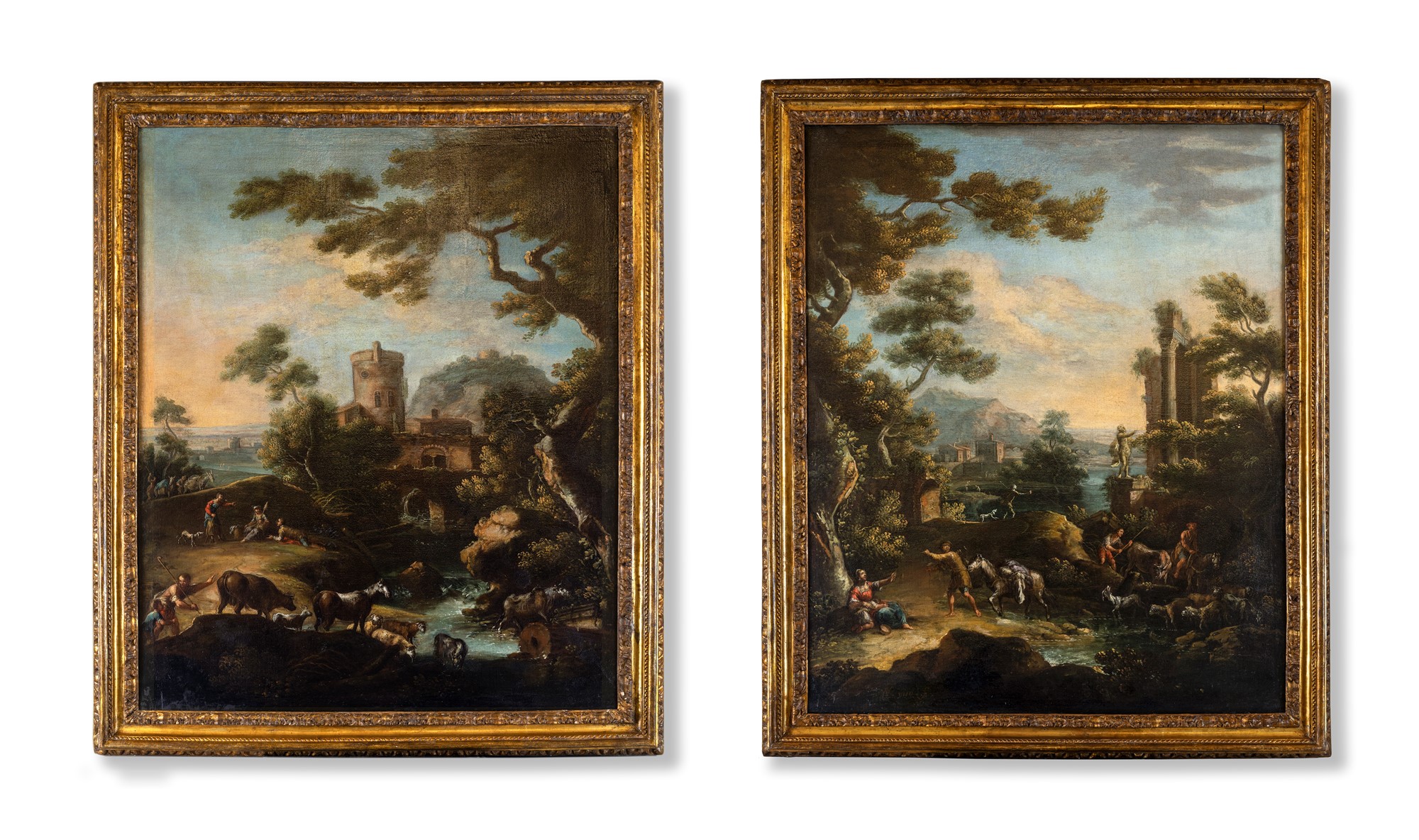 a) Paesaggio fluviale con architetture e armenti b) Paesaggio con viandanti e rovine - cm 155x128 - "Figlio di Philip Peter, meglio noto come Rosa da Tivoli e fratello di Jacob, Cajetan riprende nei suoi dipinti i soggetti e lo stile familiare animando le sue composizioni con una varietà di figure ritratte in scene di genere.