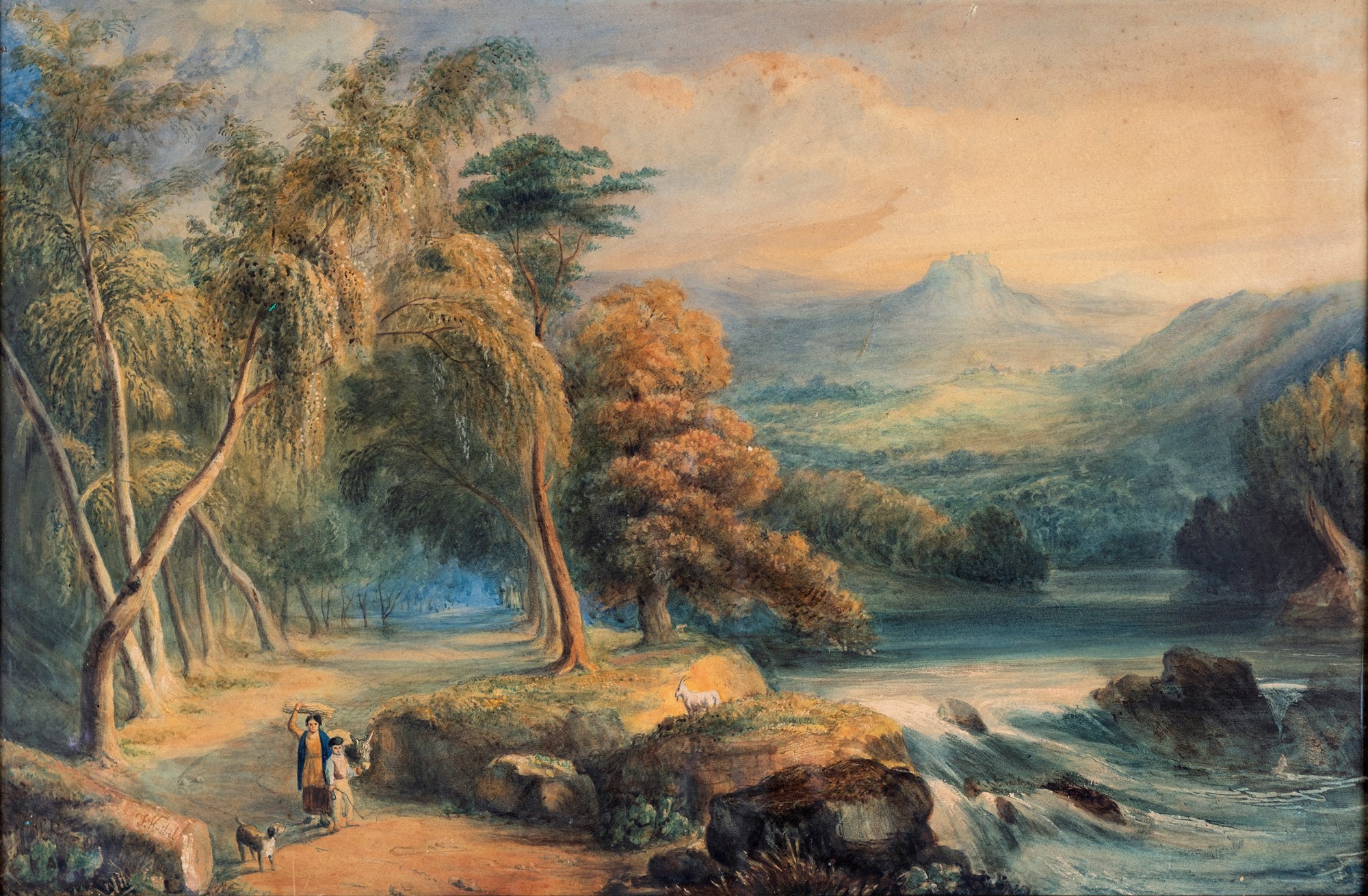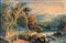 Paesaggio fluviale con famiglia viandante - Firmato in basso a sinistra. cm 49x73