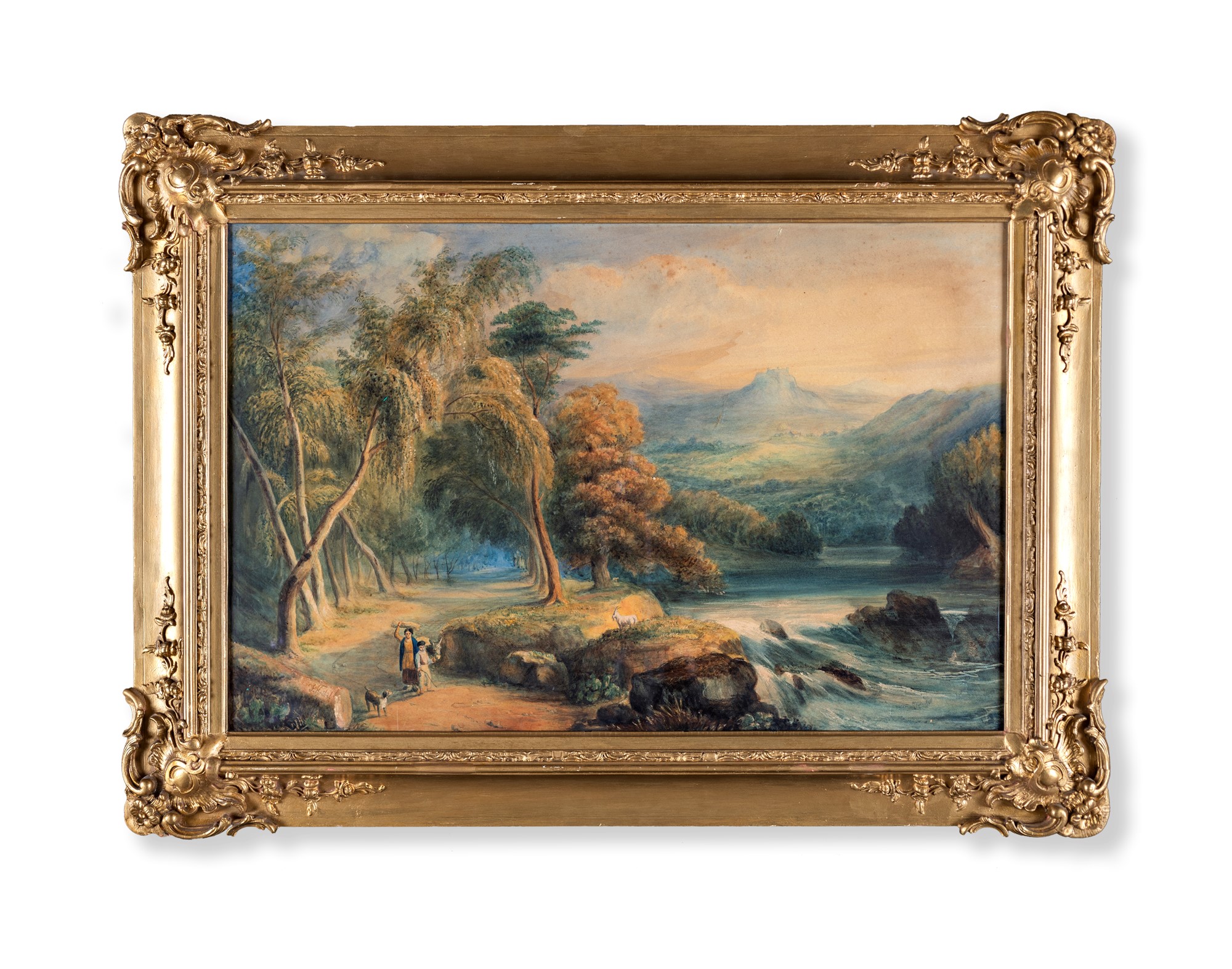 Paesaggio fluviale con famiglia viandante - Firmato in basso a sinistra. cm...